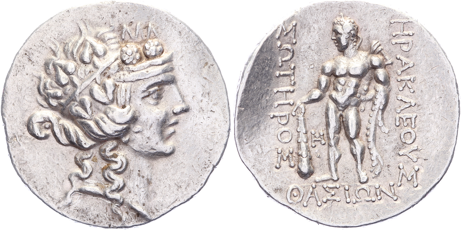 AR Tetradrachm [30,99 mm; 16,76 gm]. Head Dionysus right / HΡAKΛEOΥΣ ΣΩTHΙOΣ ΘΛΣIΩN, Hercules standing left, with lion skin cloak, holding club, monogram on inner left. SNG Copenhagen 1046. Some marks, a it wavy, gVF.