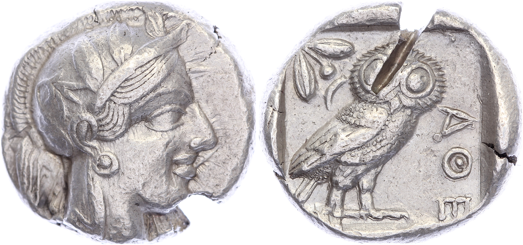 AR Tetradrachm, ca Circa 454-404 BC [23,74 mm; 16,86 gm]. Head of Athena to right, wearing crested Attic helmet decorated with three olive leaves and palmette / AΘE, owl standing right, head facing; to left, olive sprig and crescent; all within incuse square. Kroll 8; Svoronos pl. 12. Large test cut on reverse, gVF.