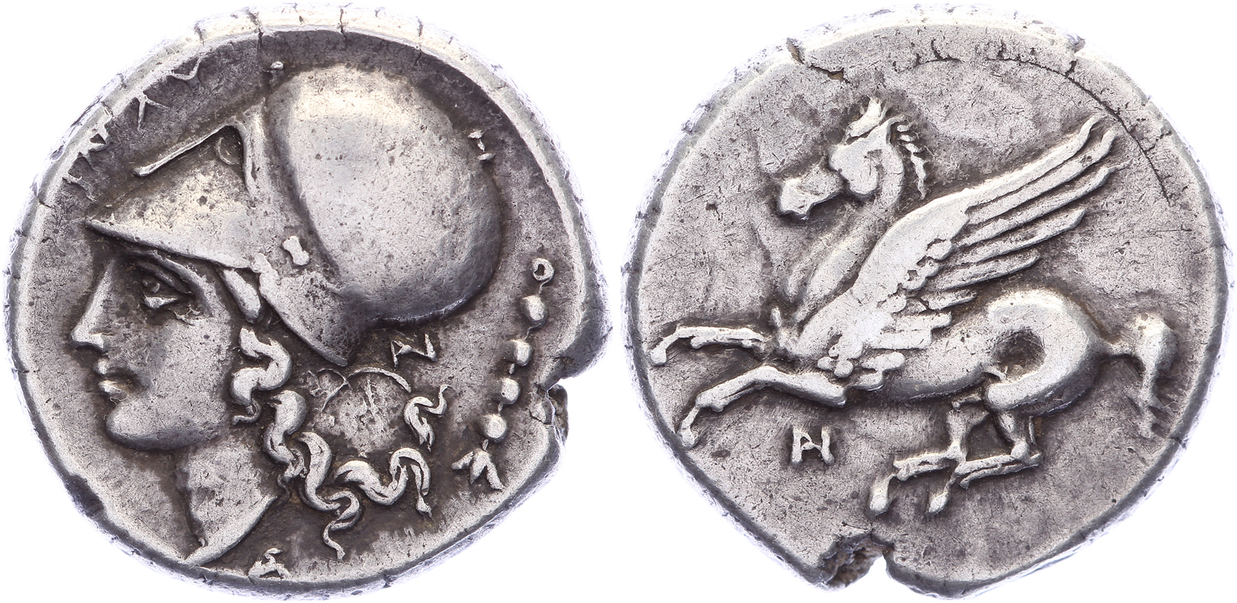 AR Stater ca. 320-280 BC. [21,19 mm; 8,55 gm]. Pegasos flying to left, monogram of AN below / Helmeted head of Athena to left, NAY above; monogram below neck, monogram and thymiaterion behind. Pegasi 73; BCD Akarnania -. Lightly toned VF.