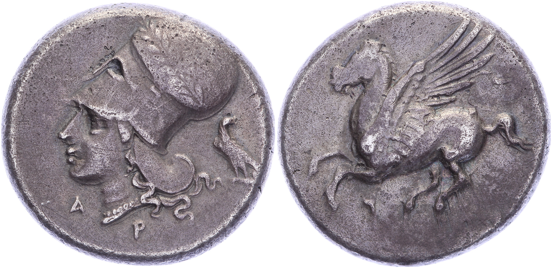 Circa 300 BC. AR Stater [20,80 mm; 8,40 gm]. Pegasos flying left / Head of Athena left, wearing laureate corinthian helmet; eagle behind; A and P below. BCD Korinth 101; Ravel 1008. Toned VF.
