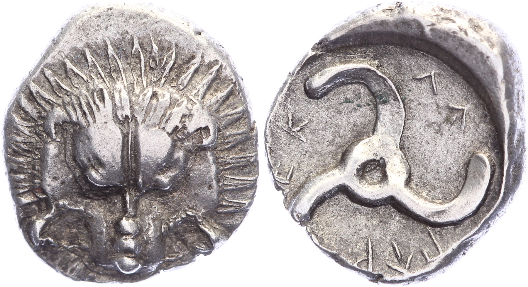 Circa 380-360 BC. AR Tetrobol - 1/3 Stater [14,58 mm; 2,62 gm]. Facing lion scalp / Π^Ρ - ΕΚ - Λ^, around triskeles; all within incuse circle. Müseler VIII.49-51; SNG von Aulock 4254-5. Nicely toned, gVF.