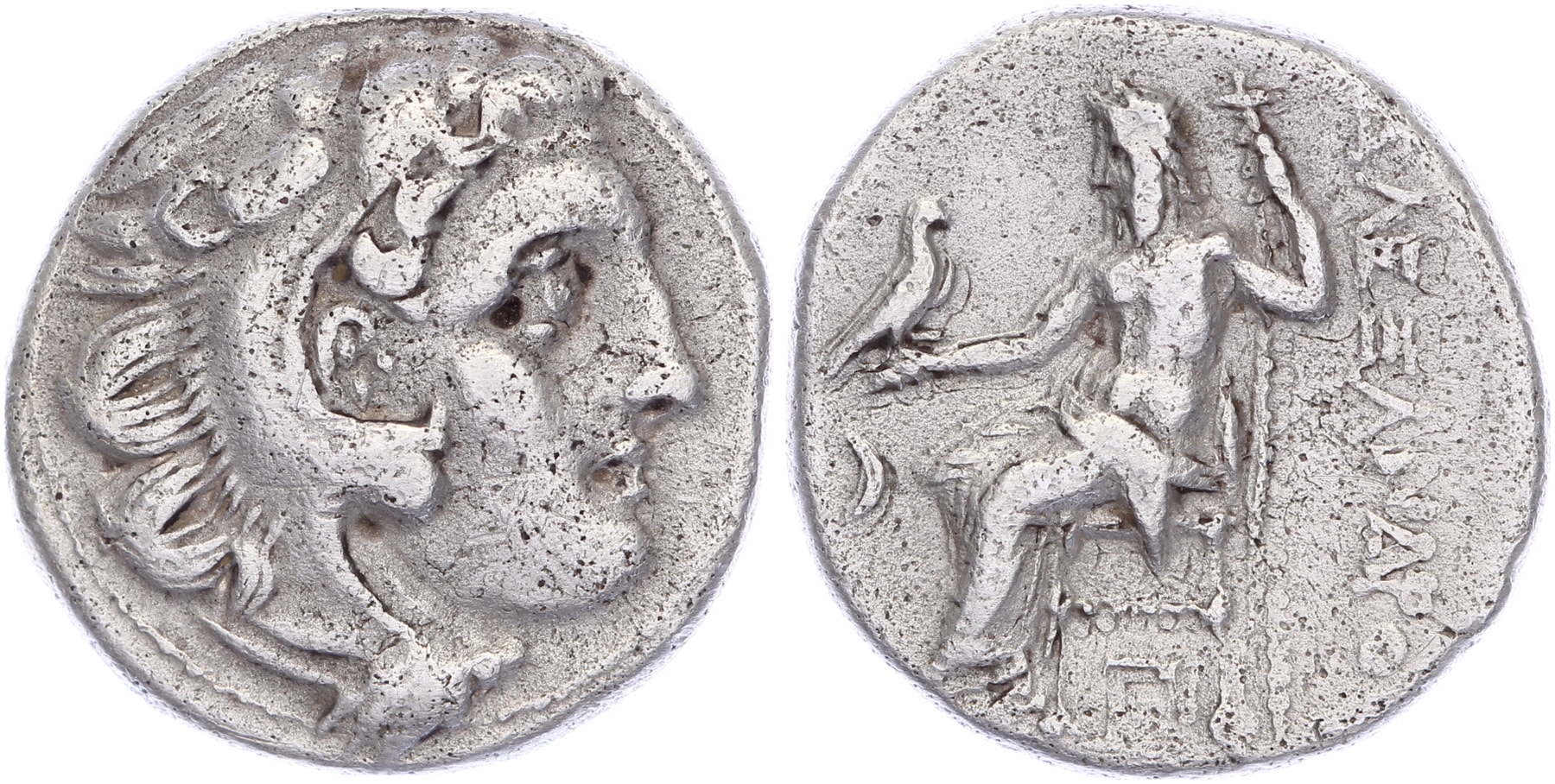 AR Drachm [17,13 mm; 4,23 gm]. Kolophon mint. Struck under Antigonos Monopthalmos, 310-301 BC. Head of Herakles right, wearing lion skin. Rev.: ΑΛΕΞΑΝΔΡΟ[Υ], Zeus Aëtophoros seated left; crescent in left field, Π below throne. Price 1813. Light die shift, porosity, toned nice VF.