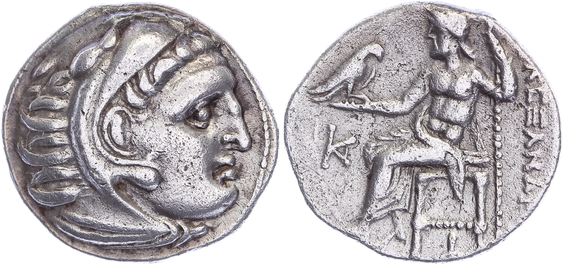 AR Drachm [18,26 mm; 4,01 gm]. Kolophon mint. Struck under Antigonos I Monophthalmos circa 310-301 BC. Head of Herakles right, wearing lion’s skin / [AΛΕ]ΞΑΝΔΡ[ΟΥ], Zeus Aëtophoros seated left; monogram in left field; Φ below throne. Price 1823. Minor porosity, VF.