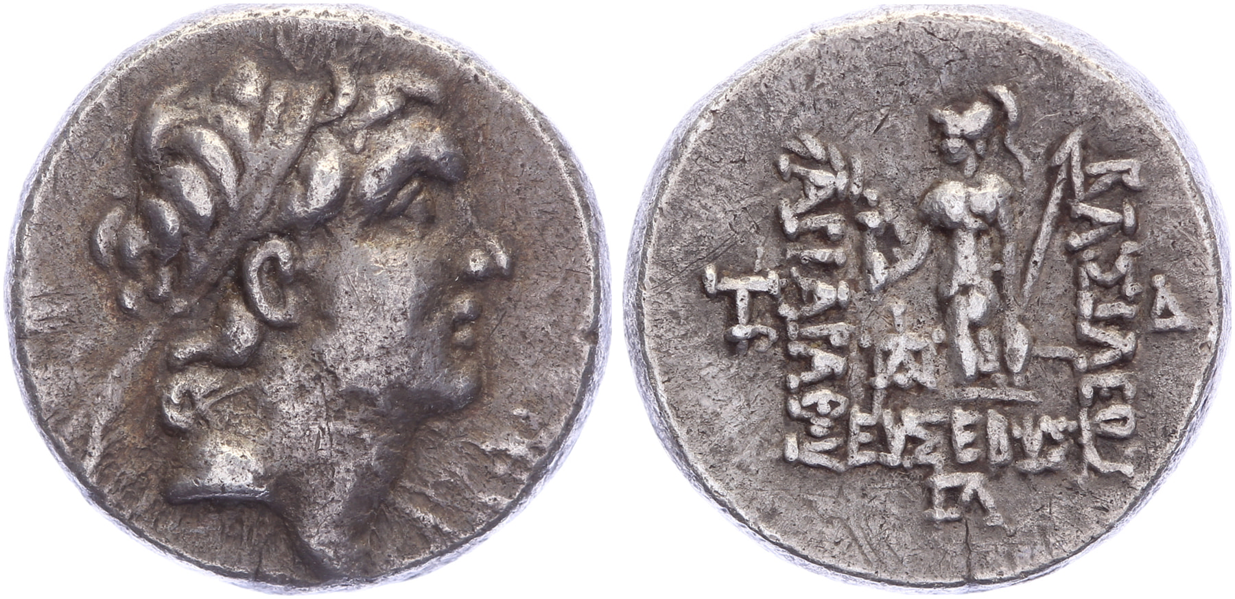 AR Drachm [16,27 mm; 4,11 gm]. Dated CY 33 (130 BC). Diademed head right / BAΣIΛEΩΣ - EΥΣEBOΥΣ –AΡIAΡAΘOΥ, Athena standing left, holding Nike, spear, and shield; T to outer left, monogram to inner left, Δ to outer right, ΓΛ (date) in exergue. Simonetta (Ariarathes IV) 24a; Simonetta, Coins (Ariarathes IV) 16a; DCA 454. Toned VF.