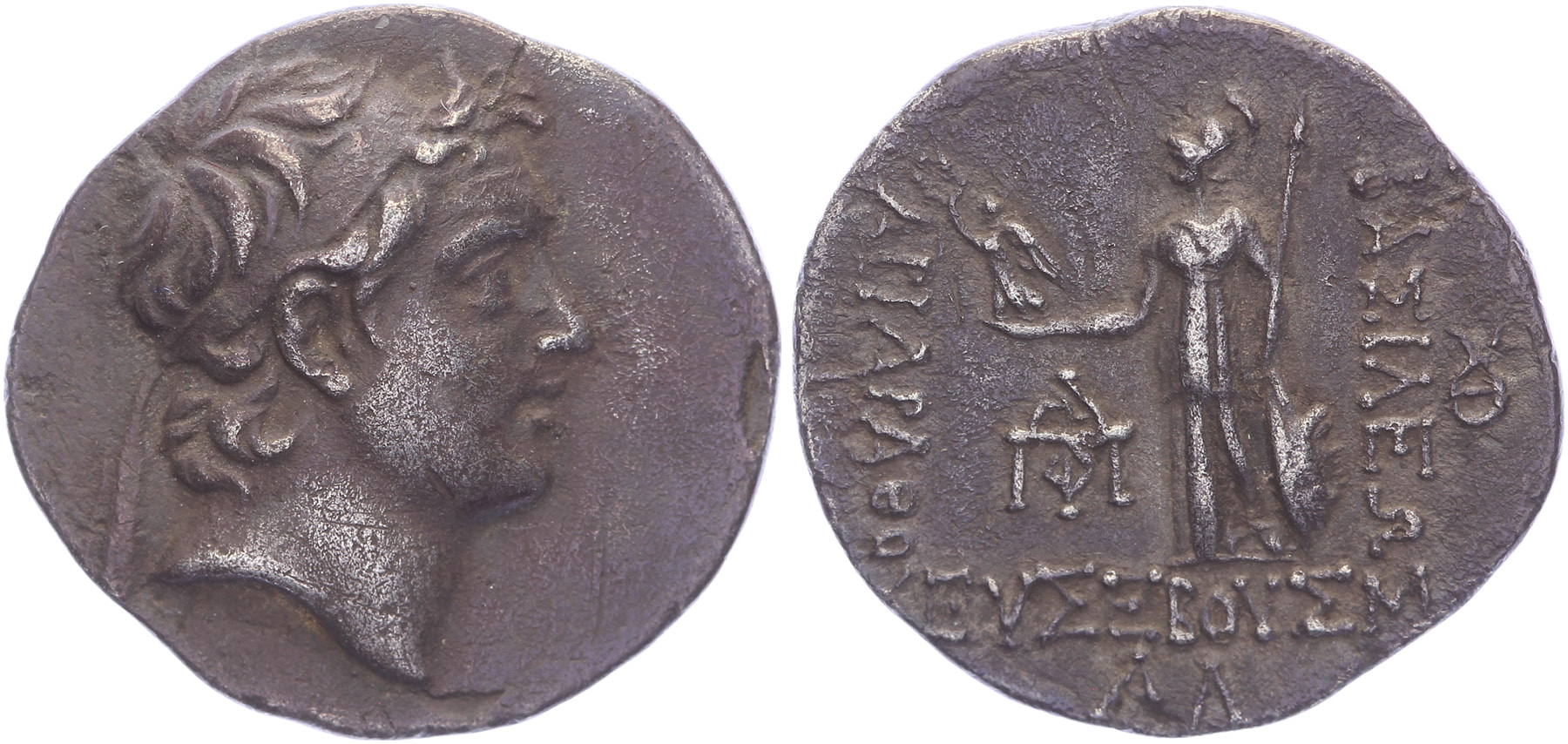 AR Drachm [19,59 mm; 3,97 gm]. Dated CY 31 (132 BC). Diademed head right / BAΣIΛEΩΣ - EΥΣEBOΥΣ – AΡIAΡAΘOΥ, Athena standing left, holding Nike, spear, and shield; in left field monogram; ϴ in right field; AΛ (date) in exergue. Simonetta (Ariarathes IV) 24a; Simonetta, Coins (Ariarathes IV) 16a; DCA 454. Darkly toned VF.