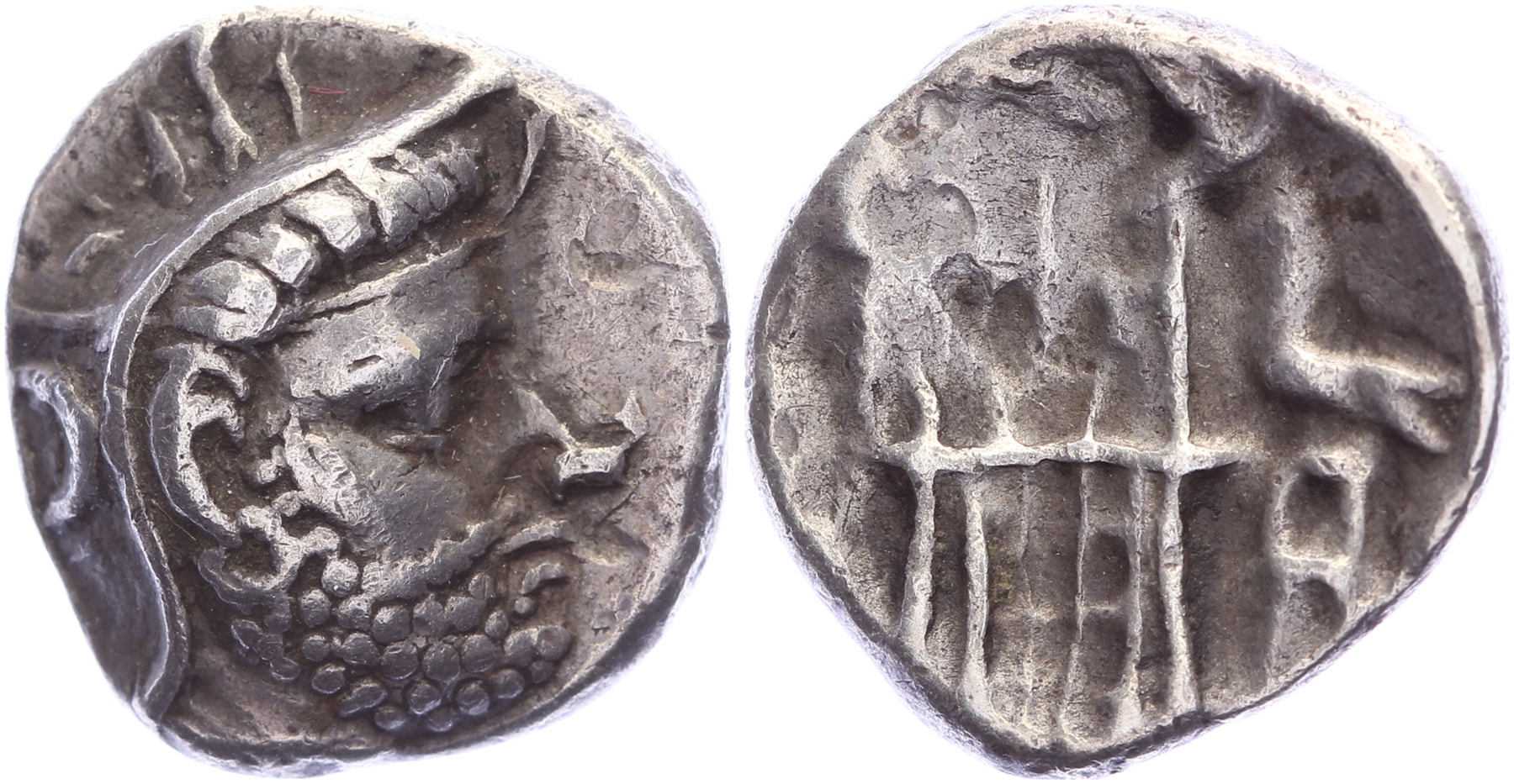 2nd Century BC. AR Drachm [14,82 mm; 4,06 gm]. Persepolis mint. Head right, wearing diadem and satrapal cap (kyrbasia) surmounted by eagle / Fire temple, Ahura-Mazda above, on left, king standing right, to right, standard surmounted by eagle. Alram 551. BMC p. 207, 7. Worn reverse die, toned gVF.