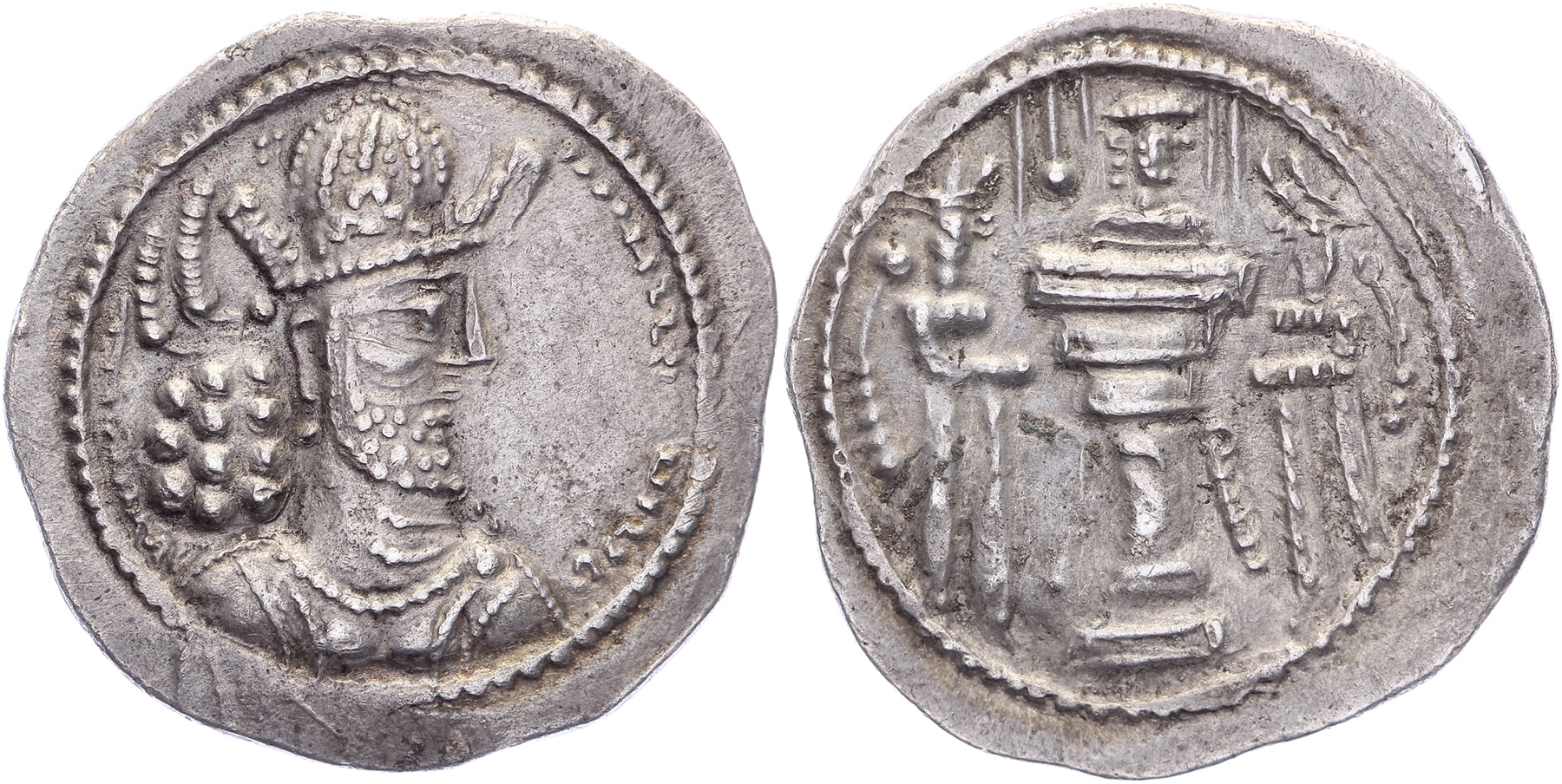 AR Drachm [24,12 mm; 4,10 gm]. Draped bust of Shapur right, diademed and wearing turreted crown with korymbos / Fire altar flanked by two attendants; bust right within flames. Göbl type 1a/6a; Sellwood 32; Sunrise 830. Toned gVF.