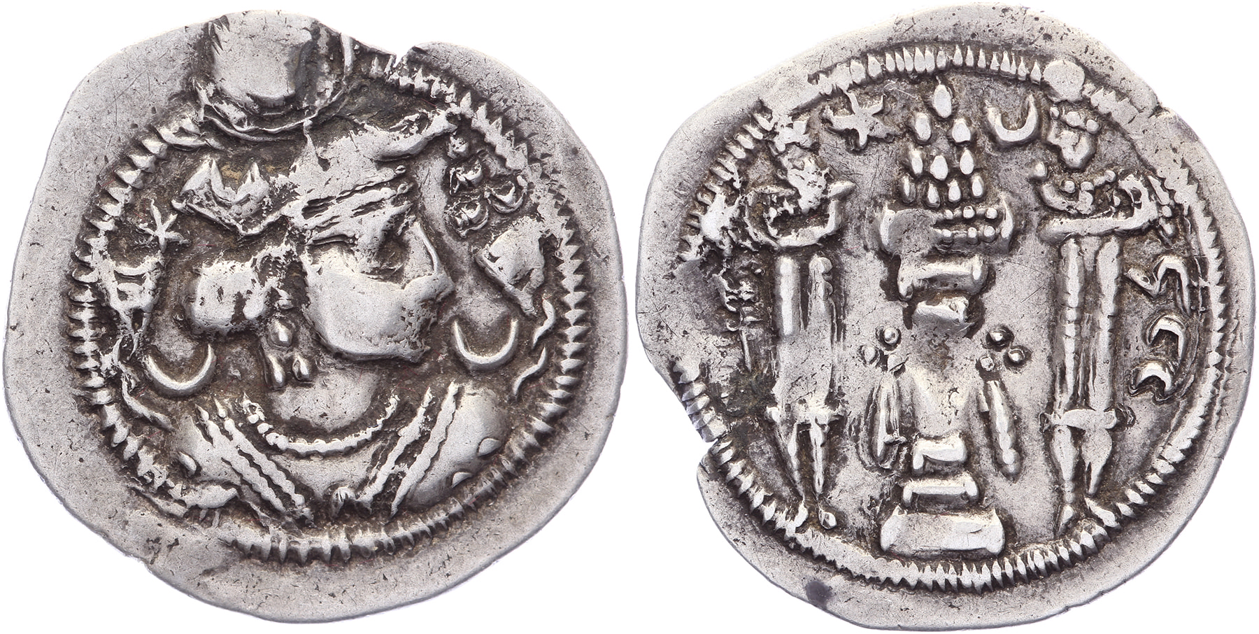 AR Drachm [27,11 mm; 3,96 gm]. GW. First/second reign. Crowned draped bust / Fire-altar with attendants. Göbl.183. Toned VF.
