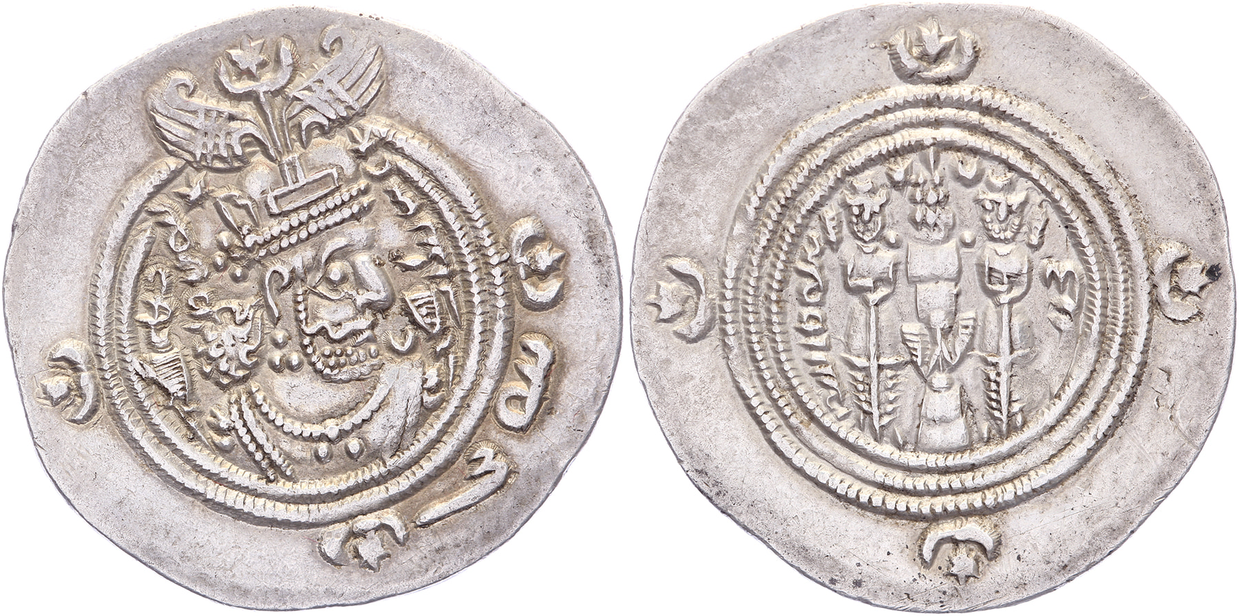 AR Drachm or Dirhem [31,47 mm; 4,11 gm]. Darabgird mint, dated year 35 (A.D. 621), with word “praise” in outer margin. Crowned Sassanian style bust right / Fire altar flanked by attendants; star and crescent flanking flames. Sellwood type 62, Göbl 214. gVF.