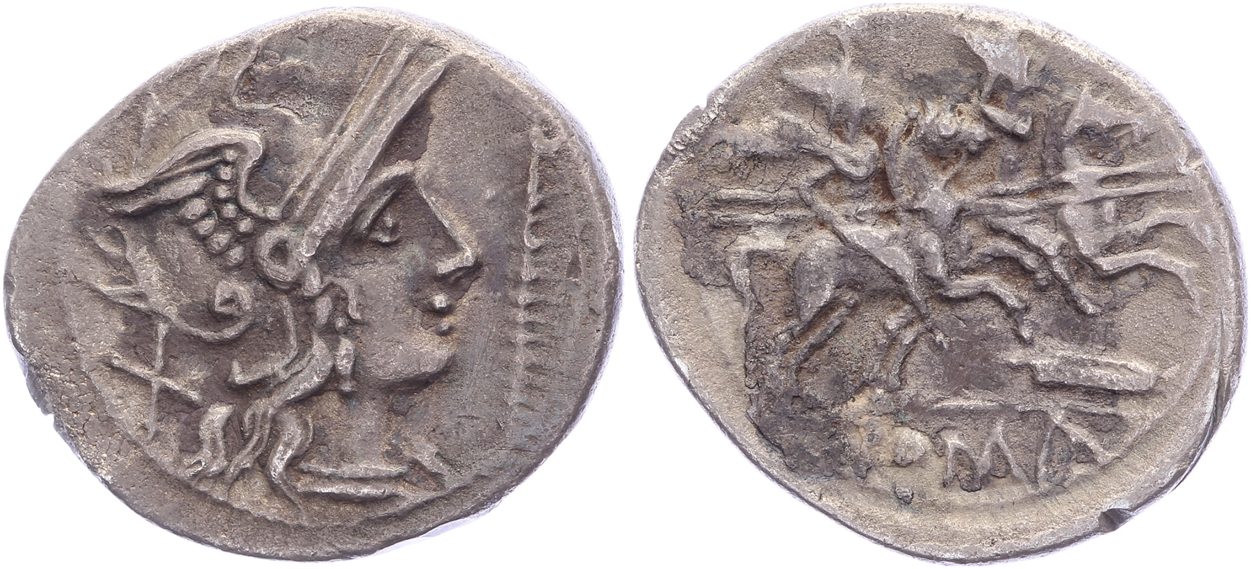 AR Denarius [19,51 mm; 2,83 gm]. Staff and feather Series. Rome mint. Helmeted head of Roma to right, with curl on left shoulder; staff before, X behind / The Dioscuri riding to right, feather below, ROMA in exergue. Crawford 130/1a; RSC 20ee. Deposits, VF.
