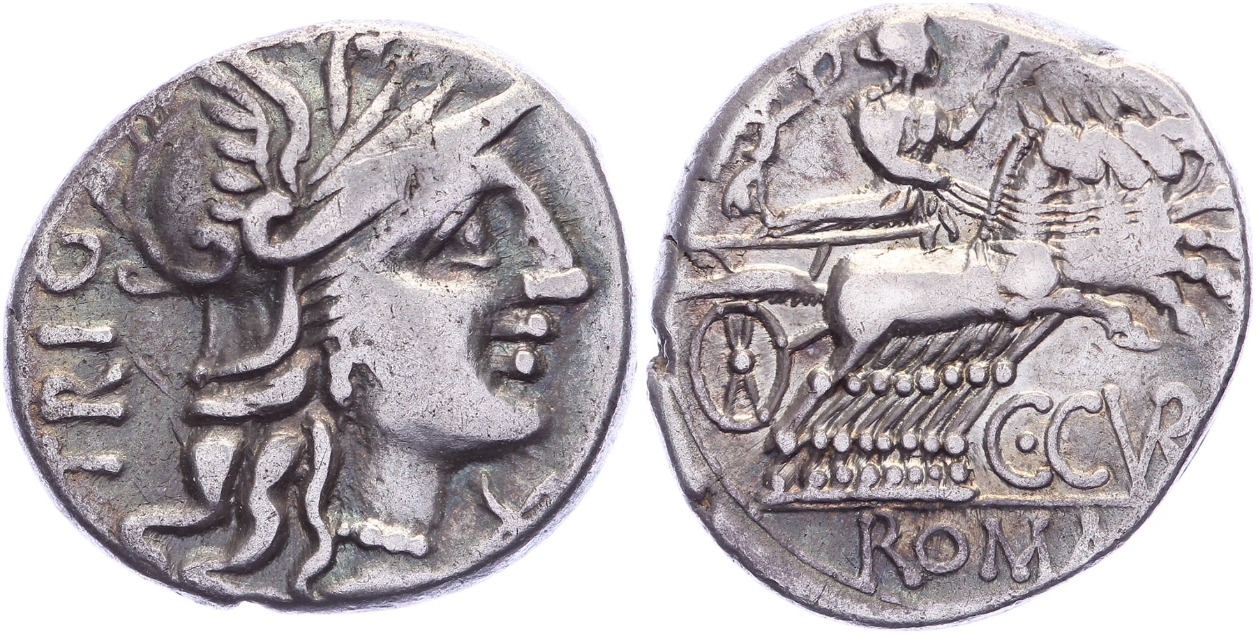 AR Denarius [18 mm; 3,86 gm]. Rome mint. Helmeted head of Roma right; X below chin, TRIG behind/ Juno, holding reins and scepter, crowned by Victory to left, driving quadriga right. Crawford 223/1; Sydenham 436, Curiatia 1. Colourfully toned. gF.