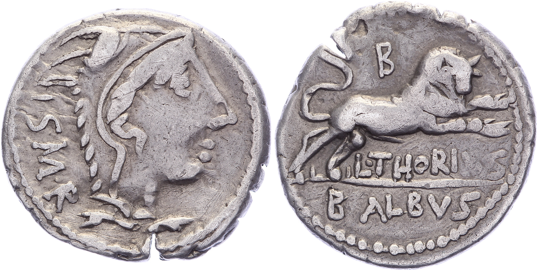 AR Denarius [18 mm; 3,83 gm). Head of Juno Sospita right, wearing goat’s skinheaddress / Bull charging right; B above. Crawford 316/1; Sydenham 598; Thoria 1. Edge cut. VF.