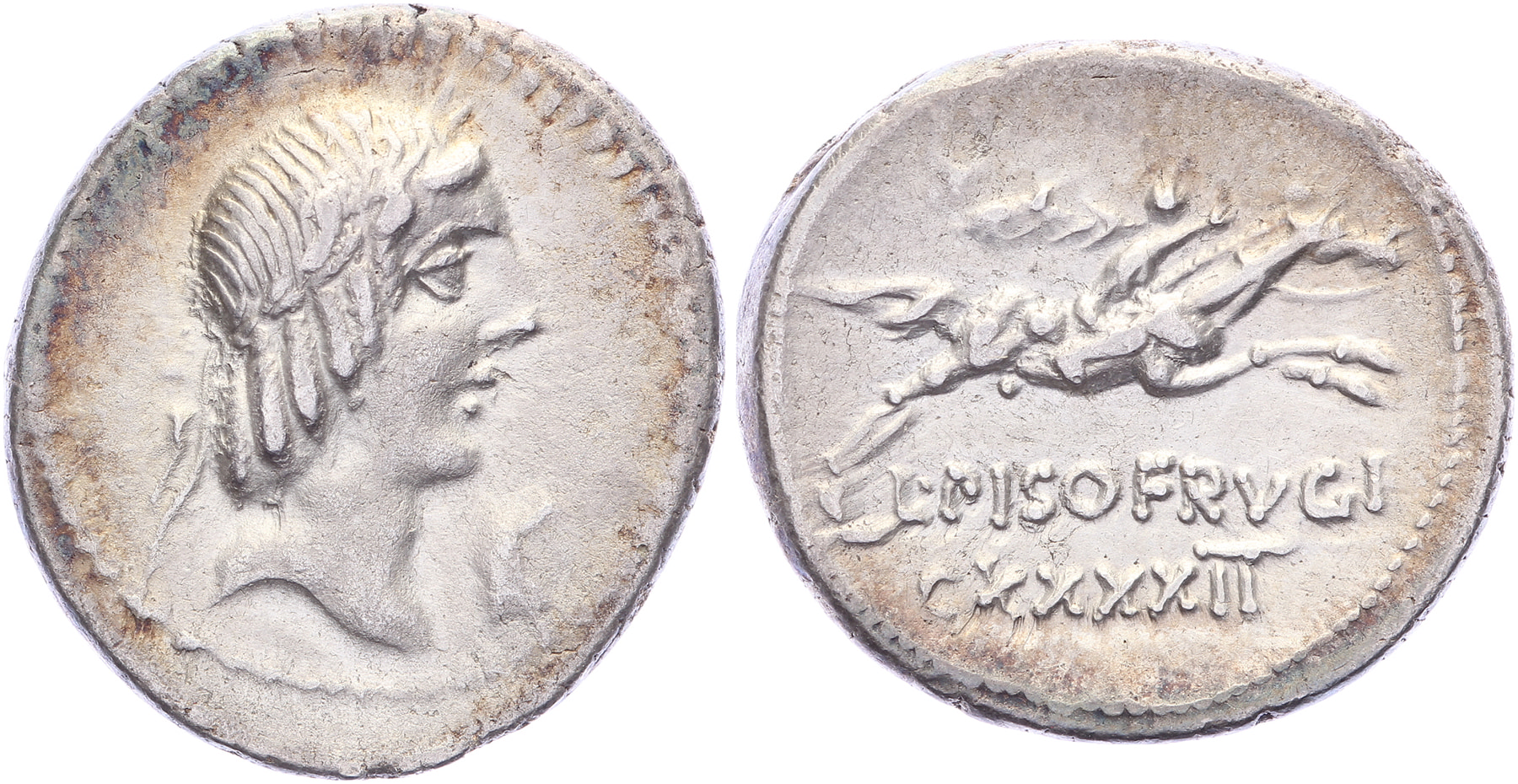 AR Denarius [16 mm; 3,88 gm]. Rome mint. Laureate head of Apollo / Horseman galloping right, holding palm frond and reins; CXXXXII below. Crawford 340/1; Calpurnia 11. Subtle golden toning, lustrous XF.