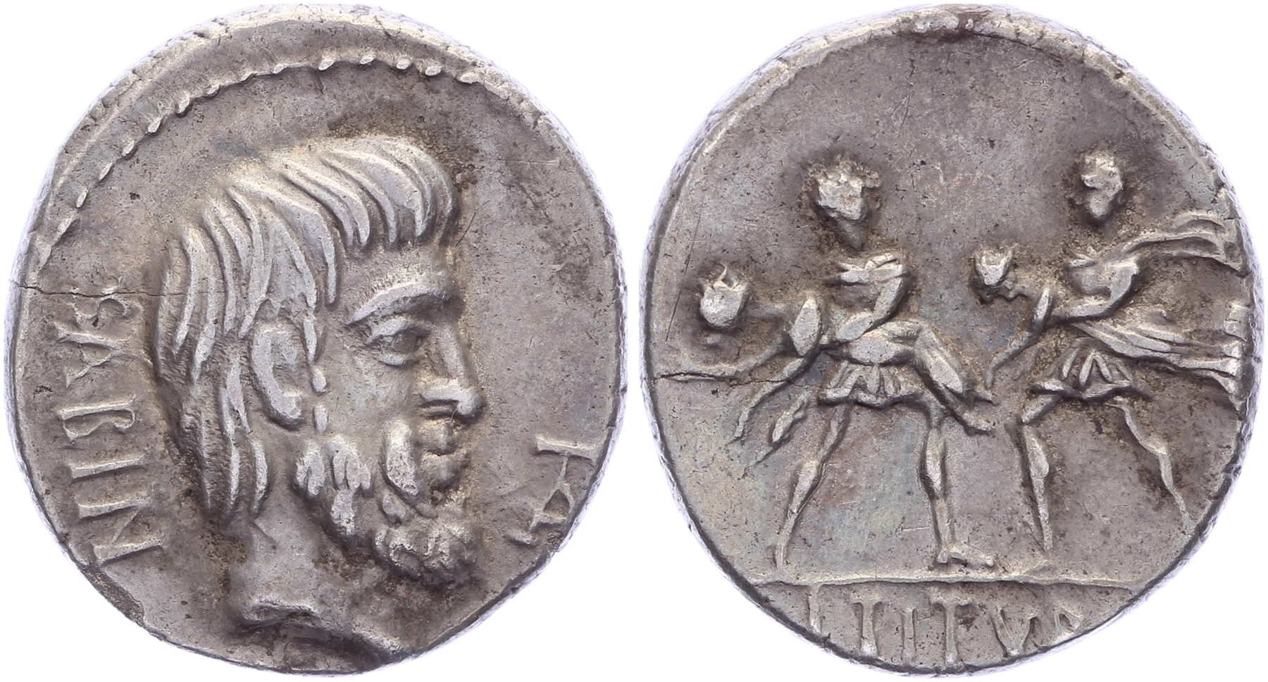AR Denarius [16,80 mm; 3,86 gm]. Rome mint. Head of Tatius right, SABIN behind, TA before / Two Roman soldiers each bearing a woman in his arms, L TITVR[I] in exergue.Crawford 344/1a; Sydenham 698; RSC Tituria-1. Lightly toned gVF.