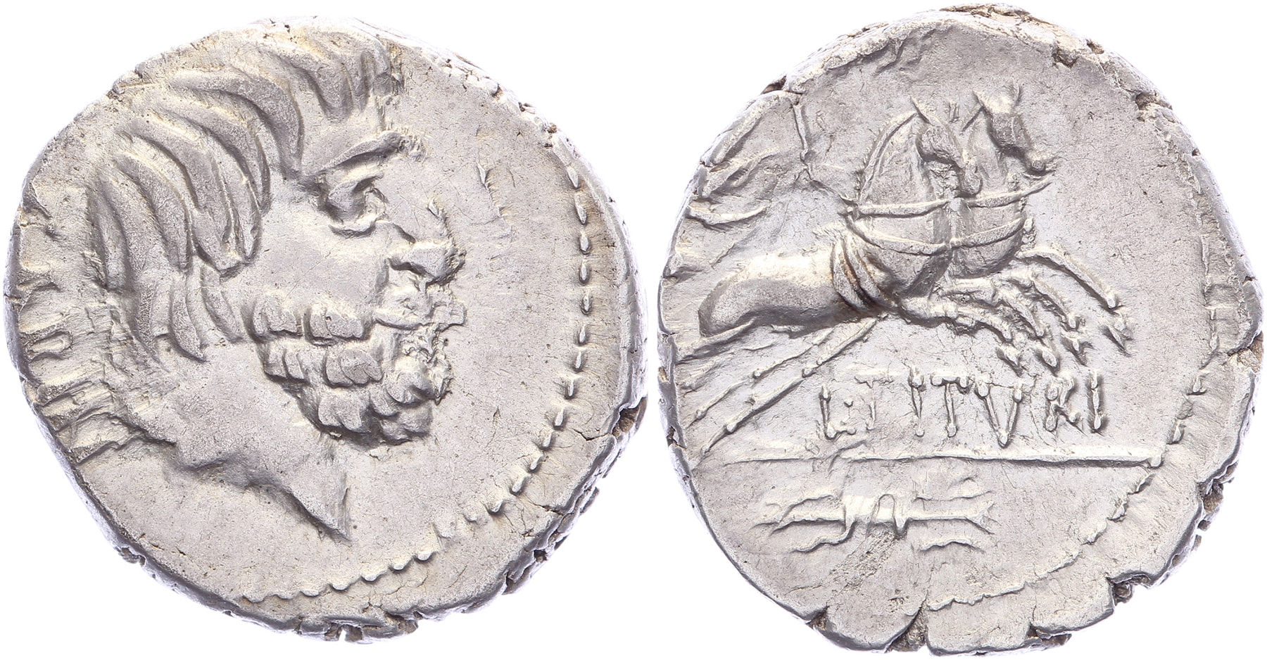 AR Denarius [17 mm; 3,78 gm]. Rome mint. Bearded head right of the Sabine king, Tatius, SABIN to the right / Victory driving biga right, holding reins and wreath, L. TITVRI, thunderbolt in exergue. Craword 344/3, Sydenham 700, Tituria 6. Struck slightly decentric, lustrous XF.