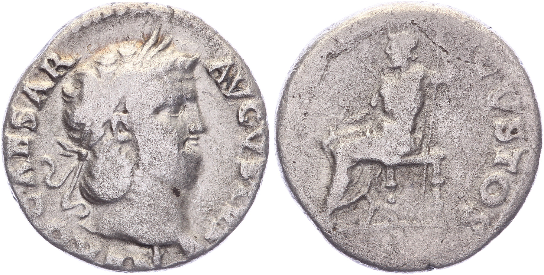 AR Denarius [16 mm; 2,97 gm]. Rome mint. Struck circa AD 64-65. Laureate head right / Jupiter seated left on throne, holding thunderbolt and scepter. RIC I 53; RSC 119. - Struck in commemoration of the protection of Nero from the Pisonian Conspiracy. F.