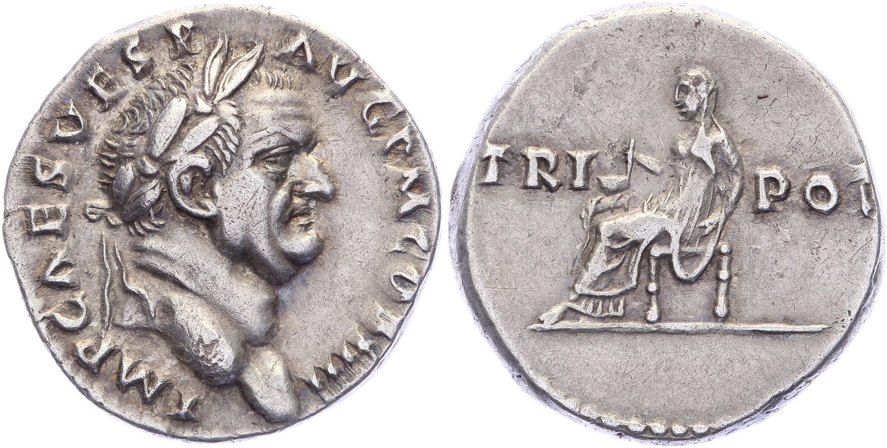 AR Denarius [17,66 mm; 3,35 gm]. Rome mint. Struck 72/3 AD. IMP CAES VESP AVG P M COS IIII, laureate head right / Vesta seated left, holding simpulum; TRI POT flanking. RIC 359; Cohen 561. Toned gVF. Added: AR Denarius Nero 54-68 AD. Aggressively tooled g[16,56 mm; 3,11 gm].