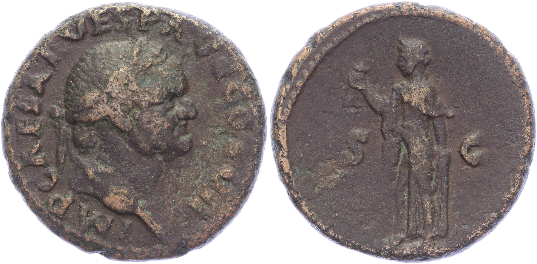 AE As [26,25 mm; 10,41 gm]. Rome mint. Struck 74-6 AD. IMP CAESAR VESP AVG COS VII, , laureate head right / Spes standing left, holding flower in right hand and raising skirt with left, S-C across field. RIC 894; BMCRE 725. aVF.