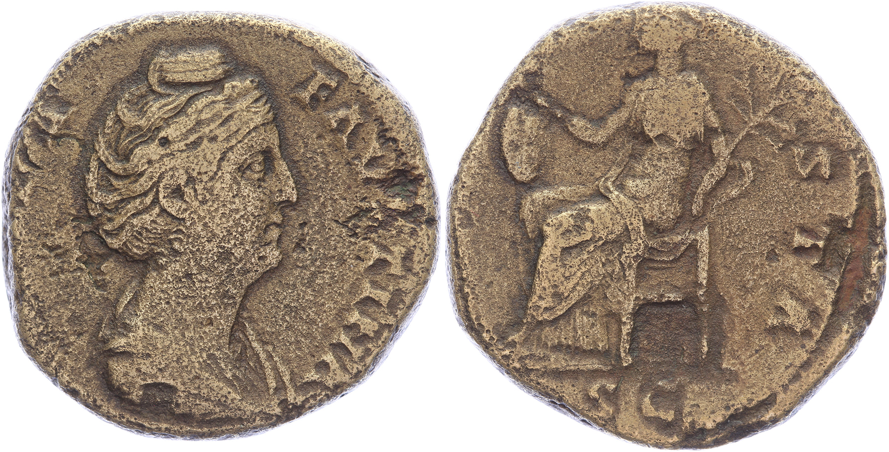 AE Sestertius [29,11 mm; 21,96 gm]. Rome mint. DIVA FAVSTINA, drpaed bust right / [AVGVS]STA, Cybele seated left holding drum and branch; S C in exergue. RIC III 1123. Rough, aVF.