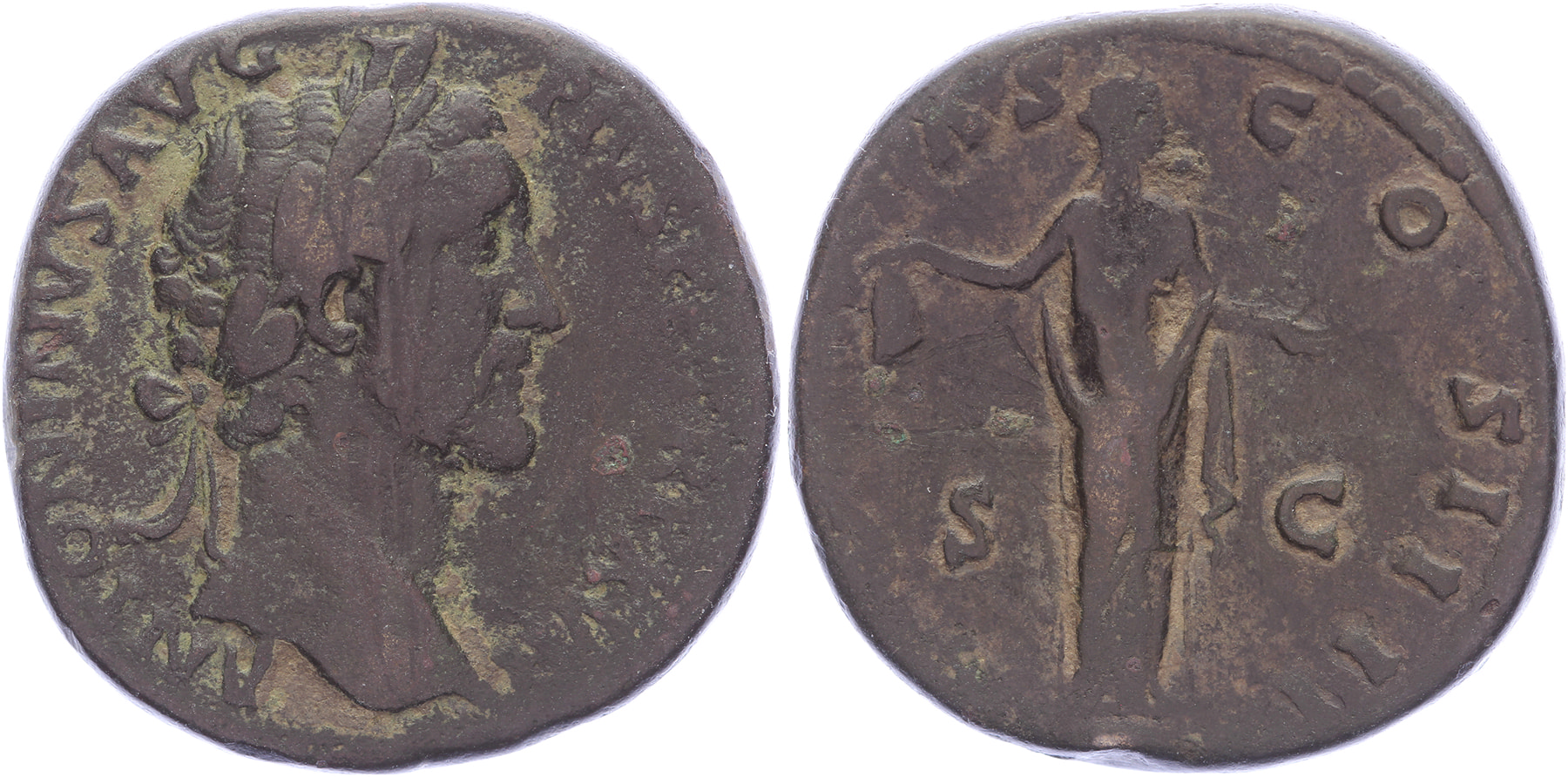 AE Sestertius [30,89 mm; 27,41 gm]. Rome mint. Struck 153/4 AD. ANTONINVS AVG PIVS P P TR P XVII, laureate head right / LIBERTAS COS IIII / S - C, Libertas stading right, holding pileus and extending right hand. RIC 916a; Cohen 535. gF.