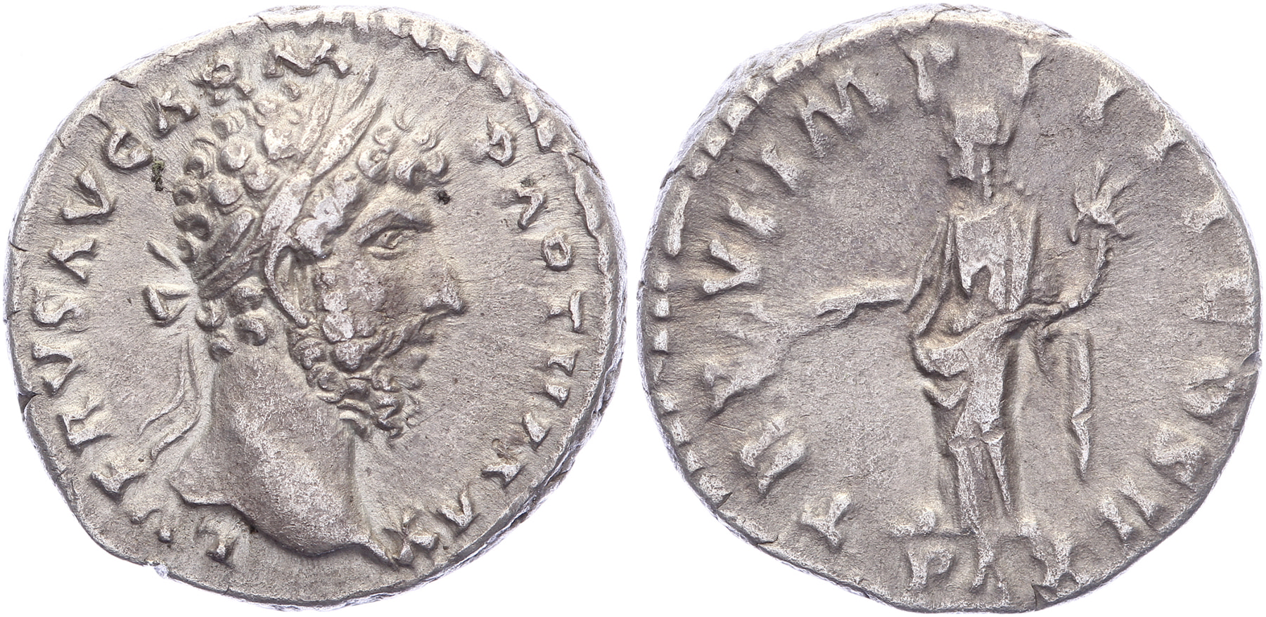 AR Denarius [17,98 mm; 3,35 gm]. Rome mint. Summer-December 166 AD. L VERVS AVG ARM PARTH MAX, laureate head to right / TR P VI IMP IIII COS II, Pax standing front, head to left, holding olive-branch in her right hand and cornucopiae with her left. RIC 561; BMCRE 426; Cohen 126. Lightly toned VF.