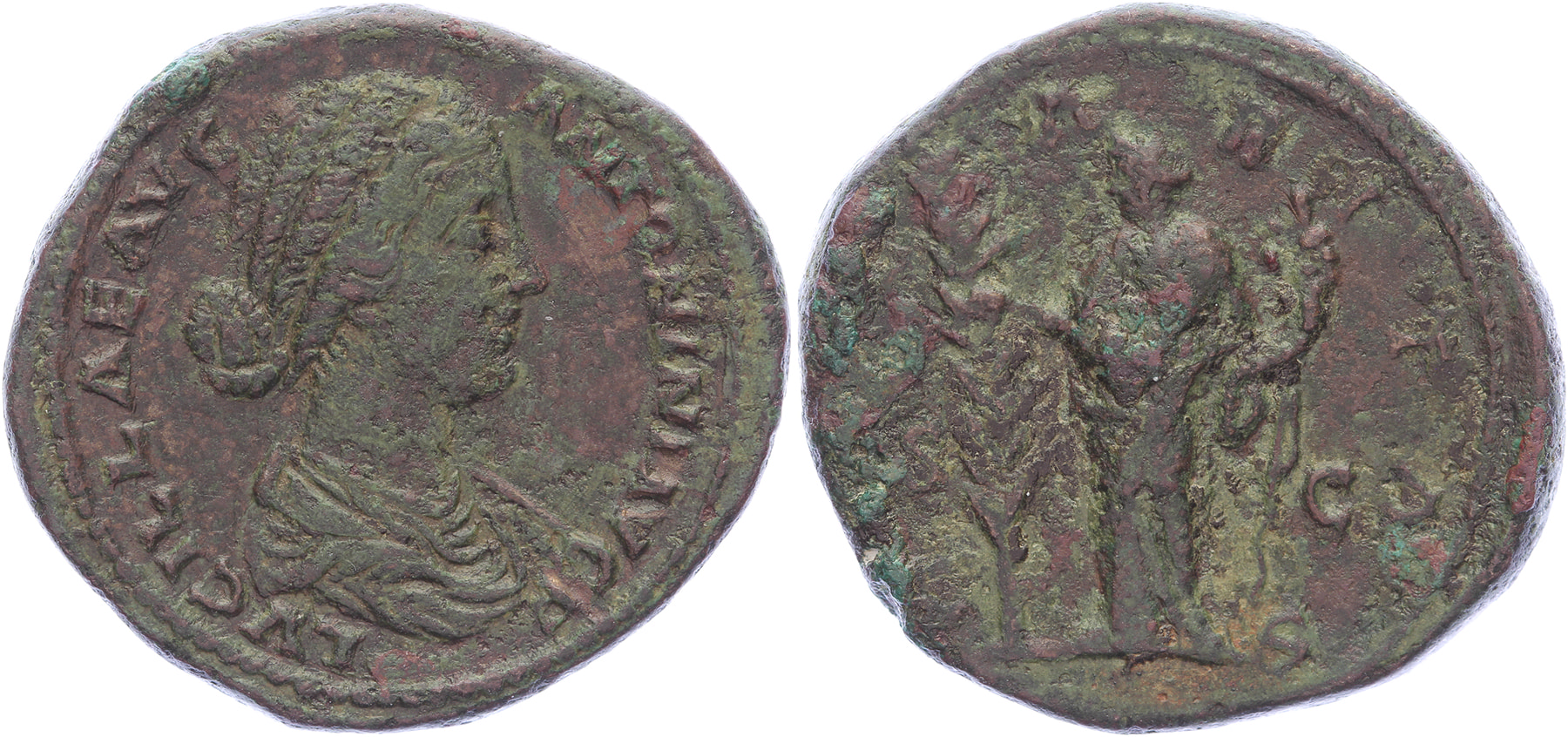 AE Sestertius [33,76 mm; 24,07 gm]. Rome mint. Struck 164-6 AD. LVCILLAE AVG ANTONINI AVG F, draped bust to right with hair tied in bun in back / HILARITAS, Hilaritas standing to left holding long palm branch in right hand and cornucopia in left hand. RIC 1742; BMCRE 1147. aVF.