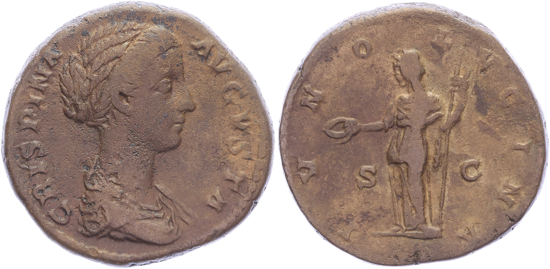 AE As [25,12 mm; 13,94 gm]. Rome mint. CRISPINA AVGVSTA, draped bust right / IVNO LVCINA / S C, Juno standing front, head to left, holding patera in her right hand and scepter in her left. Cohen 41; RIC 680; BMCRE 433. aVF.