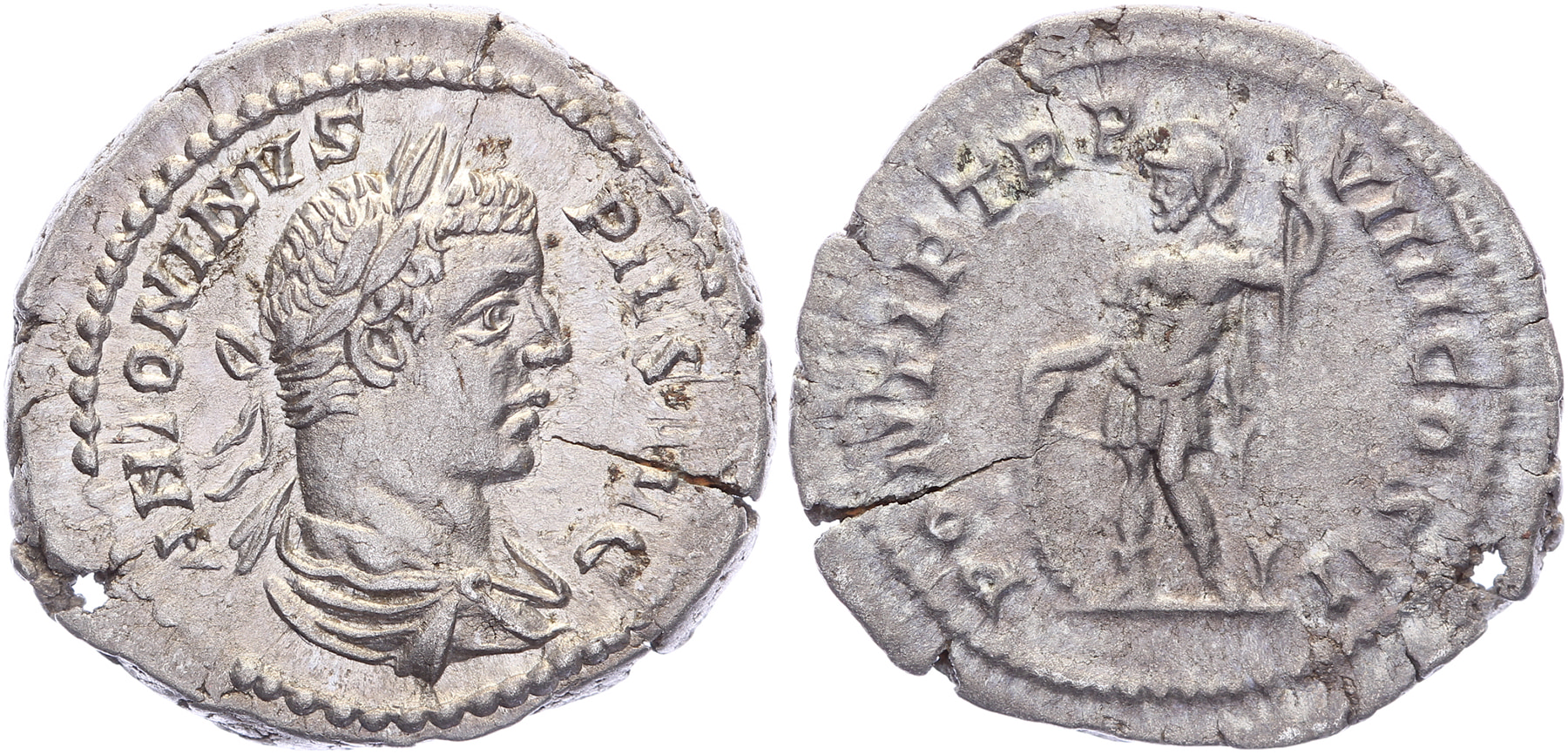 AR Denarius [20,41 mm; 3,25 gm]. Rome mint. Struck 205 AD. ANTONINVS PIVS AVG, laureate and draped bust right, seen from behind / PONTIF TR P VIIII COS II, Mars standing left, leaning on shield and holding reversed spear. RIC 81, BMCRE 482-483, C. 421, Hill 765. Flan crack, gVF.