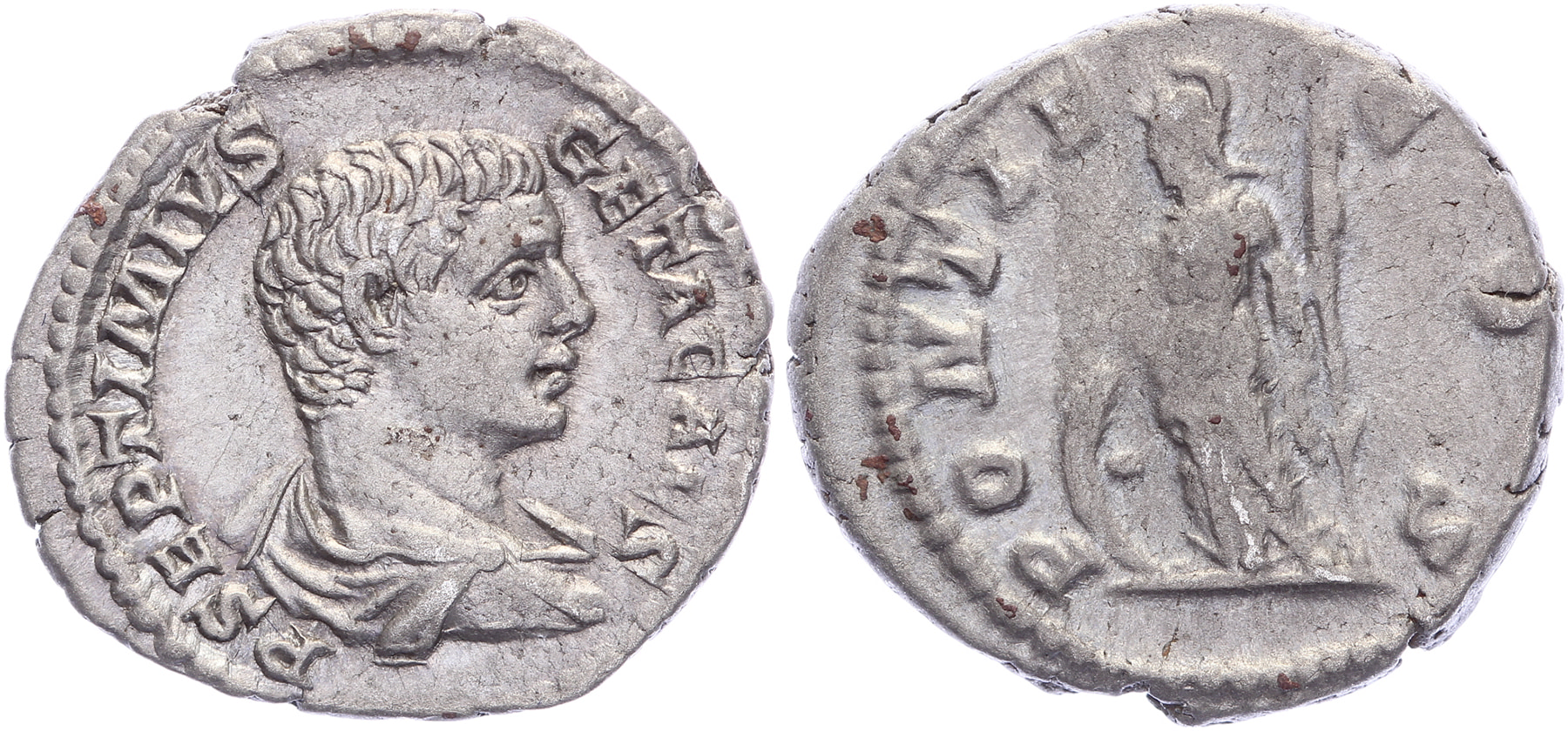 AR Denarius [19,20 mm; 3,24 gm]. Rome mint. Struck 203-8 AD. P SEPTIMVS GETA CAES, draped and cuirassed bust right / PONTIF COS, Athena standing left with spear and shield. RSC 104; RIC 34a. Worn reverse die, toned gVF.