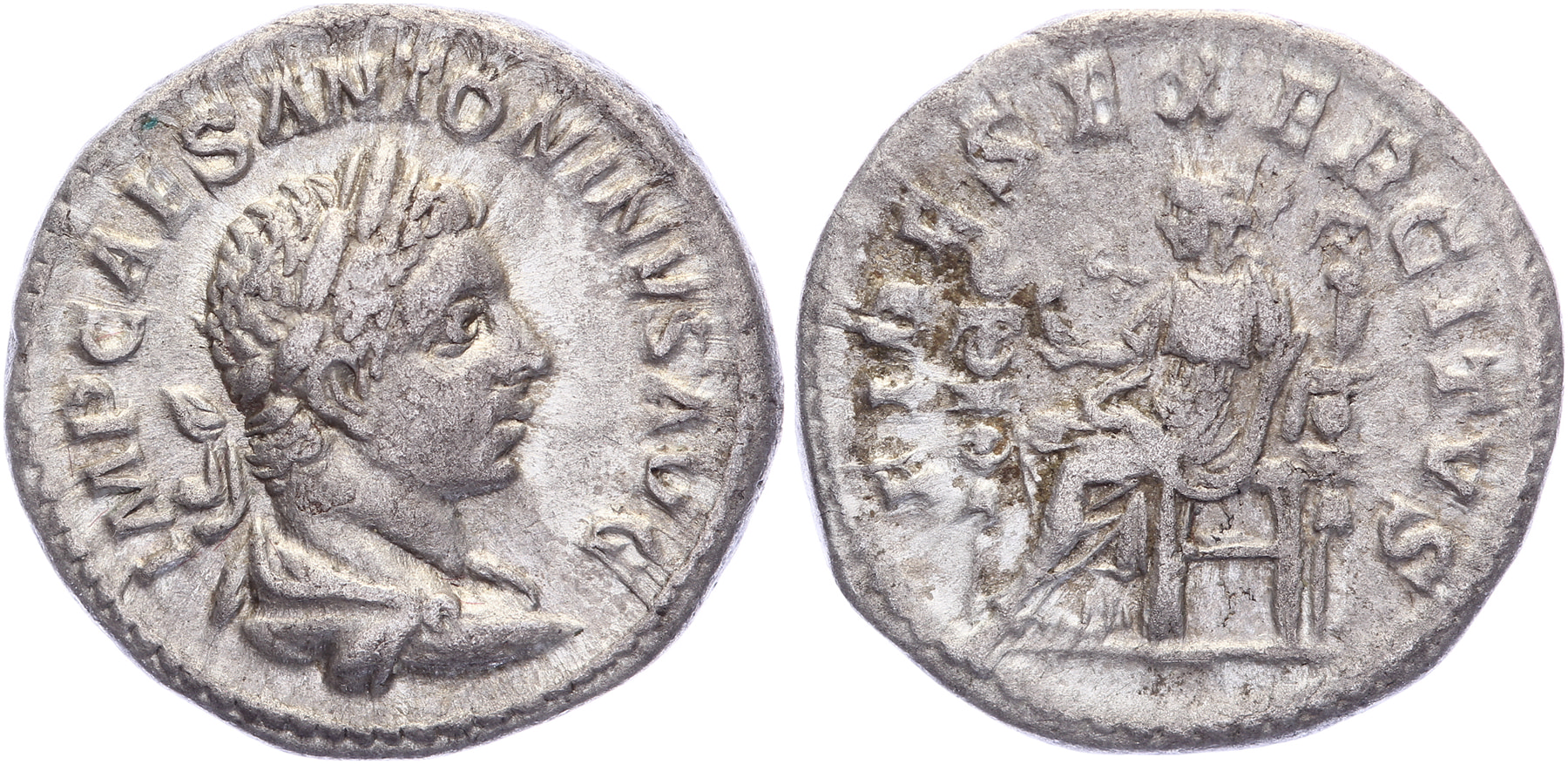 AR Denarius [19 mm; 3,19 gm]. Rome mint. struck 218 AD. Laurate bust right / Fides seated left, holding an eagle in her right hand and a standard in left, a second standard before her. RIC 70/71. Lustrous VF.