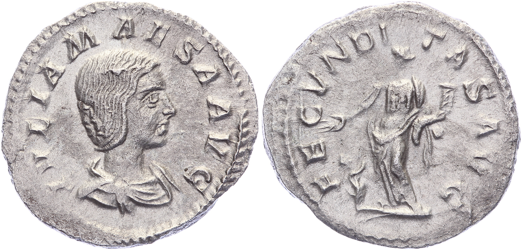 AR Denarius . [19,95 mm; 2,47 gm]. Rome mint. Struck 218-20 AD. IVLIA MAESA AVG, draped bust right / FECVNDITAS AVG, Fecunditas standing left, holding cornucopiae and extending her hand over a child at her side. RIC 249; BMCRE 61; Cohen 8. Lightly toned nice VF.