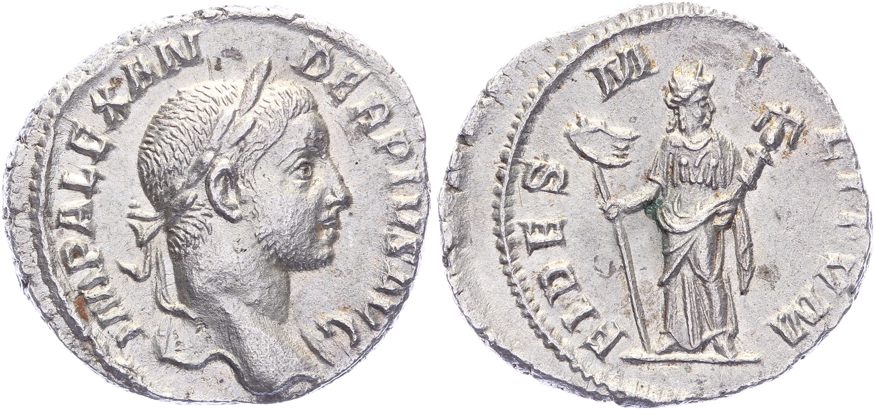 AR Denarius [19 mm; 2,62 gm]. Rome mint. Struck 231 AD. Laureate bust right, slight drapery / Fides standing facing, head right, holding vexillum and transverse standard. RIC IV 231; BMCRE 762-3; RSC 58. Lustrous. gEF.