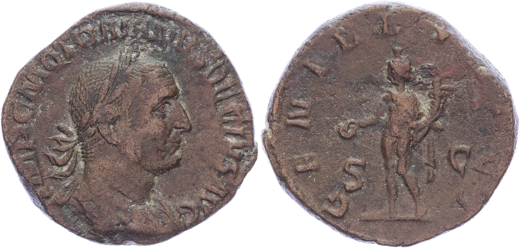 AE Sestertius [28,90 mm; 16,86 gm]. Rome mint. Struck 251 AD. IMP C M Q TRAIANVS DECIVS AVG, laureate and cuirassed bust right, seen from behind / GEN ILLVRICI / S - C, Genius standing left, holding patera and cornucopiae. RIC 116a. VF.