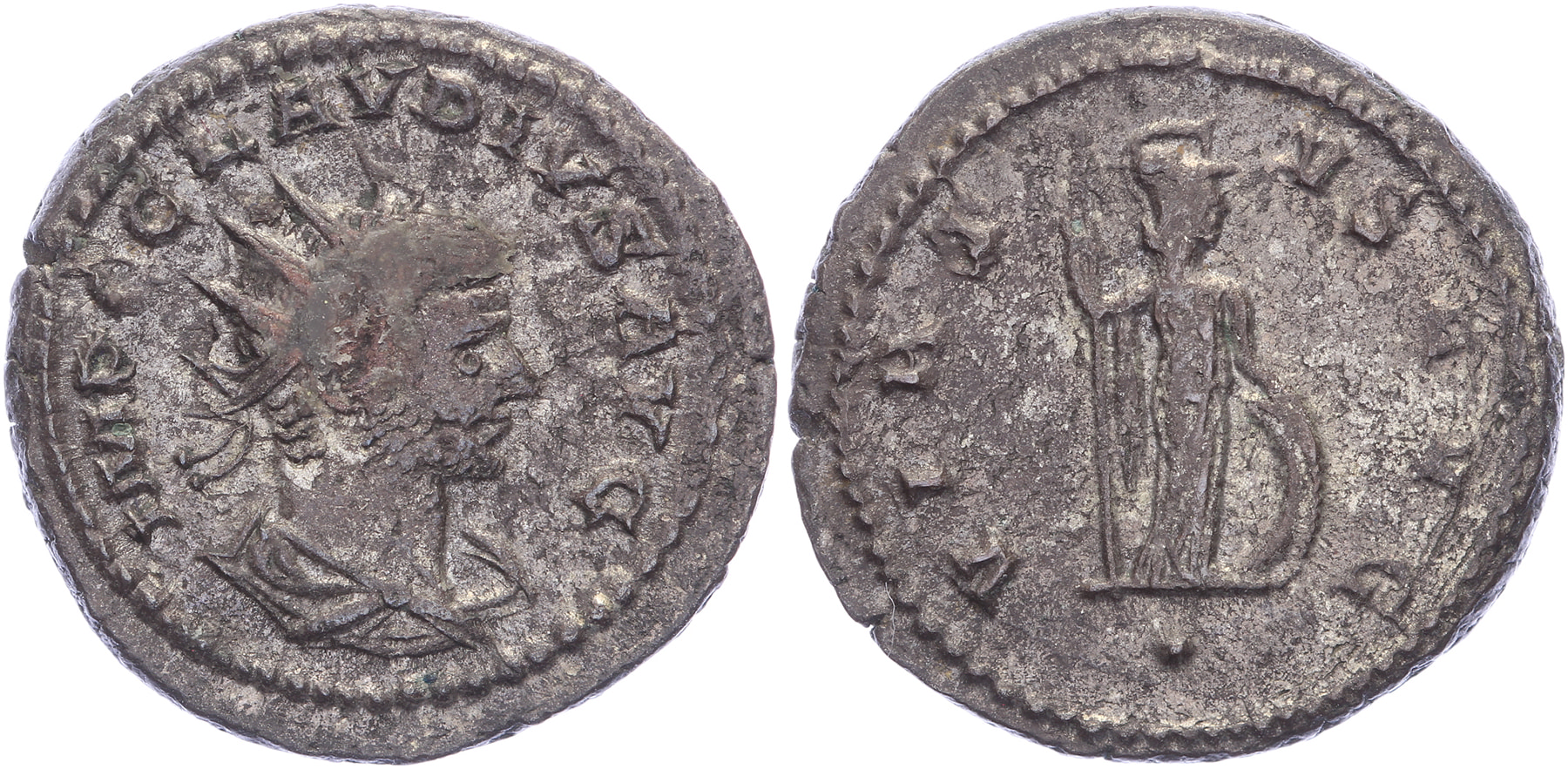 AE Antoninianus [21,07 mm; 4,37 gm]. Antioch mint. IMP C CLAVDIVS AVG, radiate, draped and cuirassed bust right / VIRTVS AVG. Minerva standing right, resting hand on shield, holding spear; pellet below. RIC online 1027 (P below). Traces of silvering, VF.