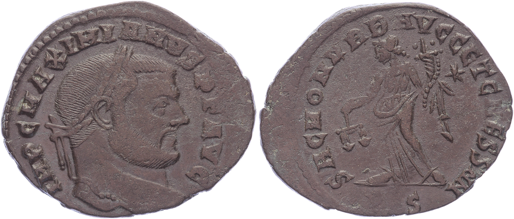 AE Follis [30,31 mm; 7,03 gm]. Rome mint. Struck circa 302/3 AD. IMP C MAXIMIANVS P F AVG, laureate head right / SACRA MONET VRB AVGG ET CAESS NN, Moneta standing front, head to left, holding scales in her right hand and cornucopiae in her left; RS in exergue. RIC 103b. Nice VF.