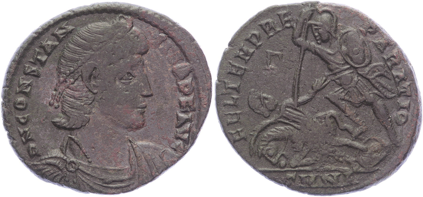 AE Centenionalis [22,92 mm; 4,53 gm]. Nicomedia mint. Struck 351-5 AD. D N CONSTANTIVS P F AVG, diademed, draped and cuirassed bust right / FEL TEMP RE-PARATIO, soldier advancing left, spearing fallen horseman leaning over horse with head turned to look back and reaching up; Γ//SMNA. RIC 84; LRBC 2300. VF.