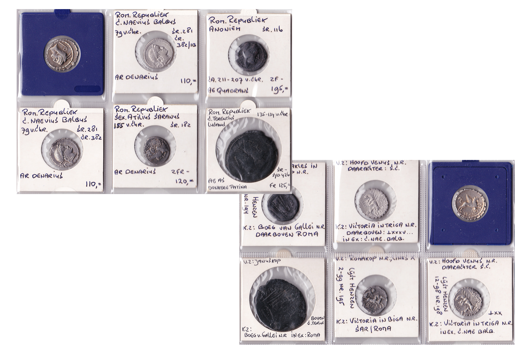 Lot (6) Roman Republic coins, mostly denarii; L. Papius (ex-mount), SEx Atilius Saranus, C. Naevius Balbus (2), as well as a bronze anonymous Quadrans and As. In decent, collectible grades.