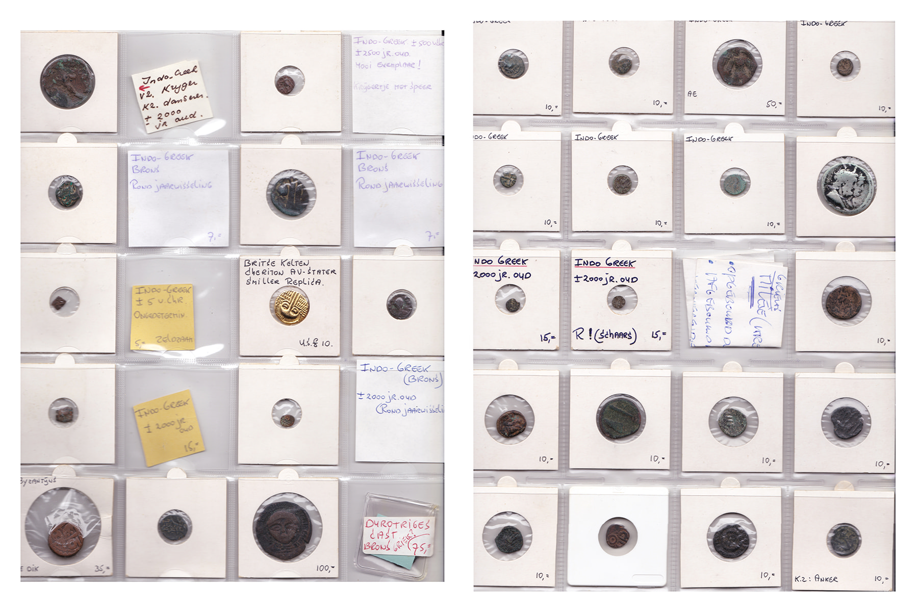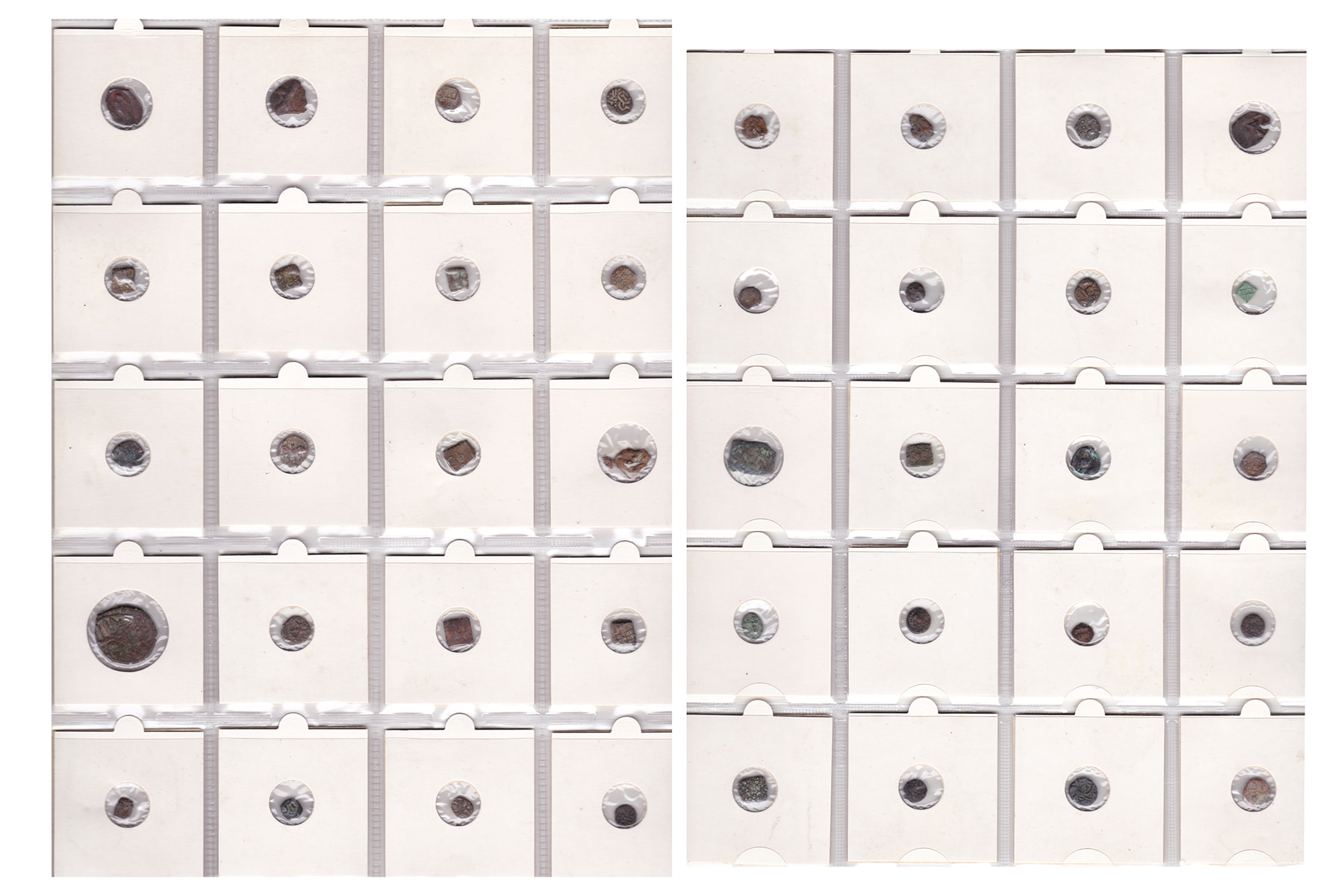Box filled with approximately 100 miscellaneous ancient coins; Indian, Islamic, Greek, Roman, later fantasies and unidentified pieces. Well-worth identifying and piecing out. Some German porcelain notgeld added at the back. Curious mix.