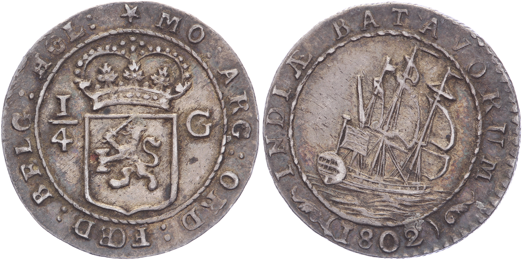 ¼ Scheepjesgulden 1802. Scholten 492e; CNO 21.3. Zeer fraai.