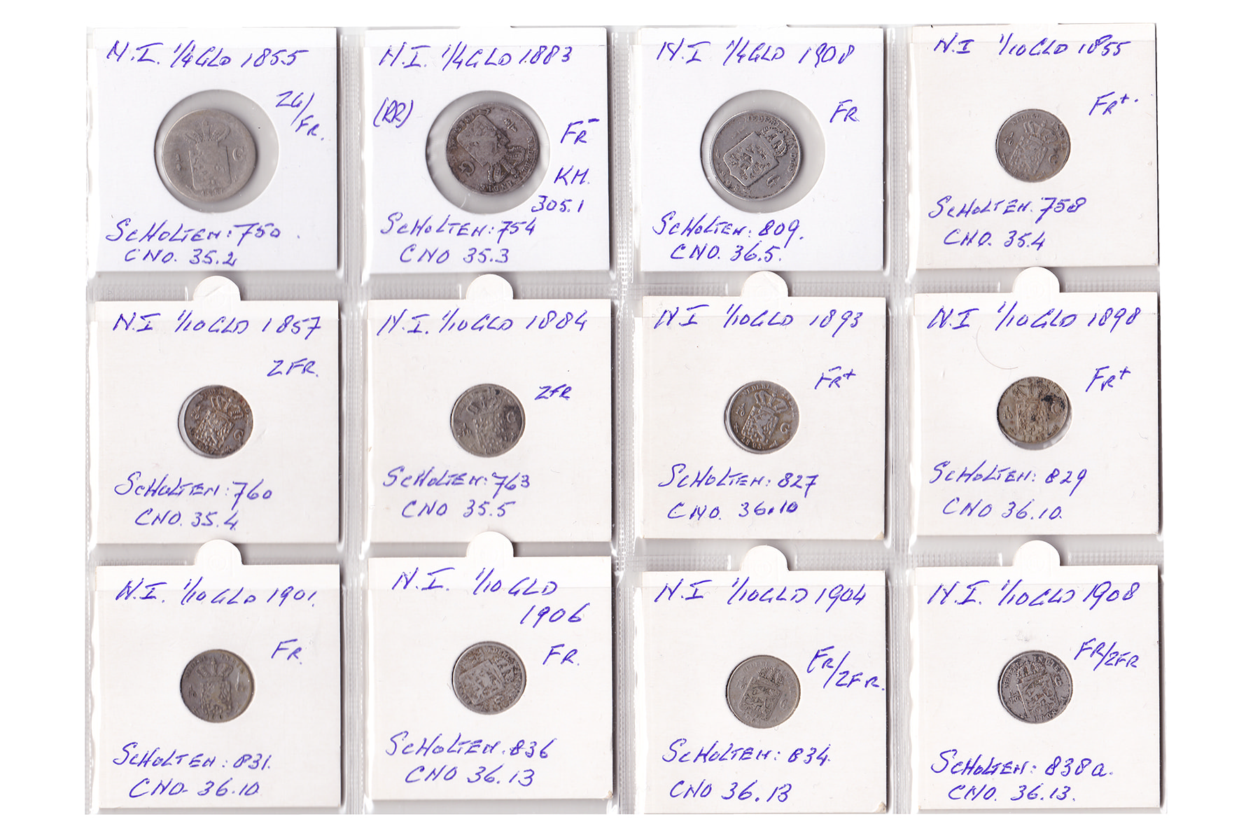 Lot (12) Nederlands-Indië. 3x ¼ gulden 1855-1883(RR)-1908; 8 x 1/10 gulden 1857-1884-1893-1898-1901-1906-1904-1908. Gemiddeld fraai / Zeer fraai.