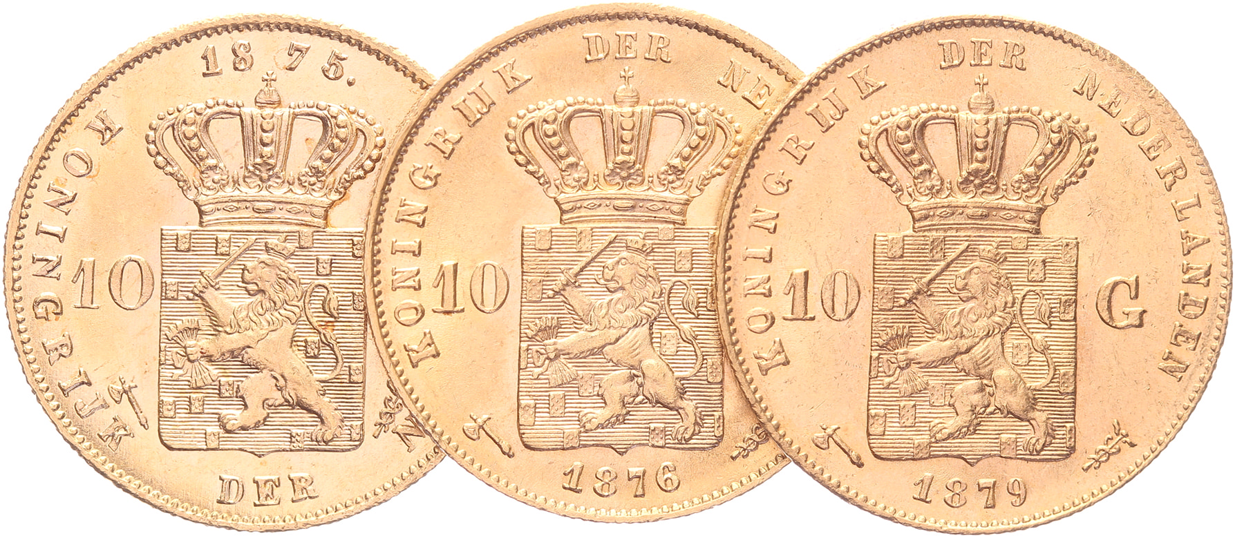 Lot (3) 10 Gulden 1875, 1876 en 1879 LSch. 430, 432, 434; Sch. 549, 550, 552 Prachtig