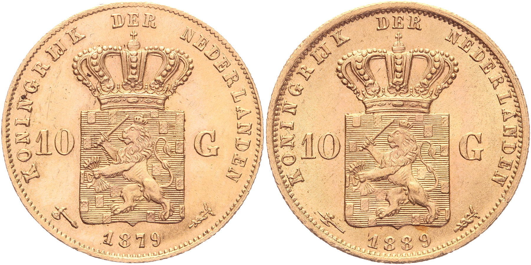 Lot (2) 10 Gulden 1879 en 1889 LSch. 434, 440; Sch. 552, 558 Prachtig
