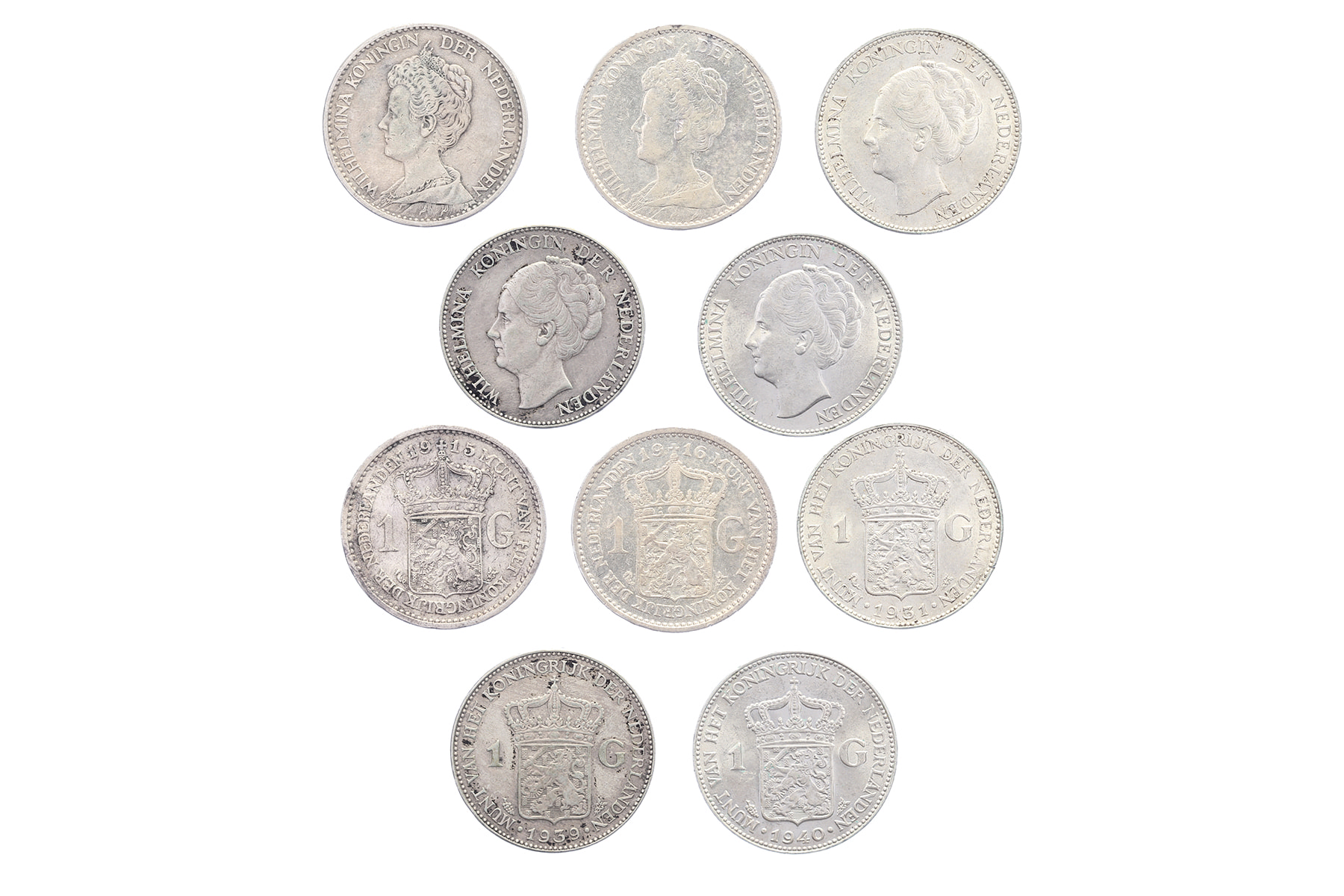 Lot (5) 1 Gulden 1915, 1916, 1931, 1939, 1940 LSch. 700, 701, 709, 711, 712; Sch. 817, 818, 826, 828, 829 Gem. zeer fraai