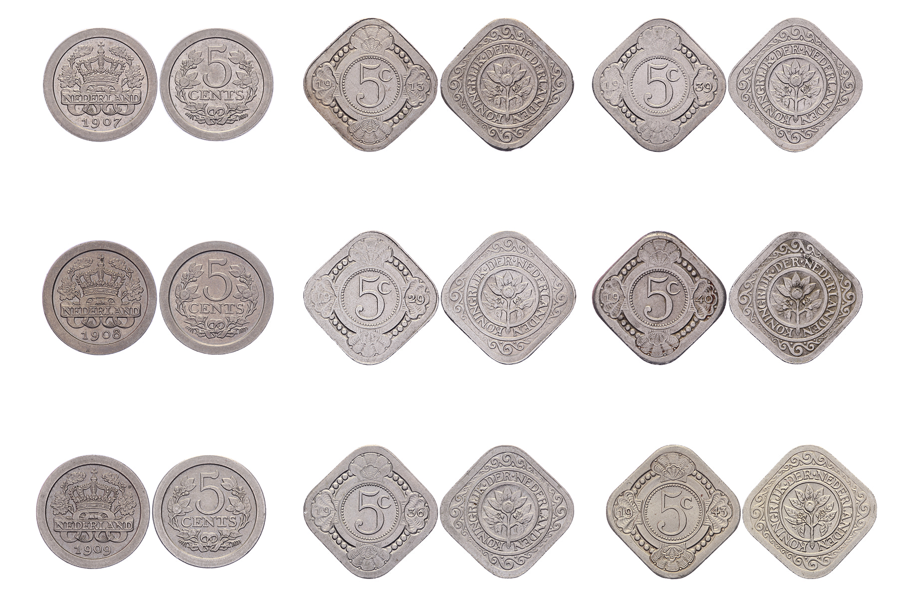 Lot (9) 5 Cents 1907, 1908, 1909, 1913, 1929, 1936, 1939, 1940 en 1943 LSch. 828-831, 834, 838, 840, 841, 842; Sch. 912-915, 918, 922, 924, 925, 1285. Deze verdienen een slabbedje Prachtig / FDC ⁂