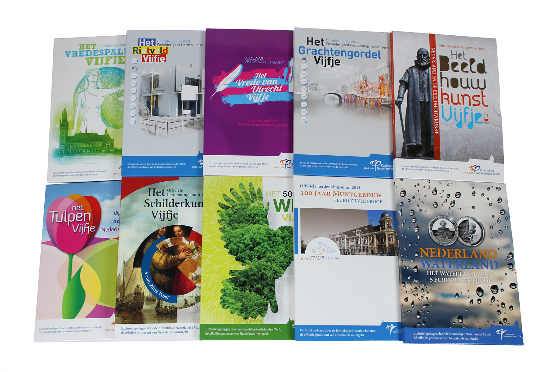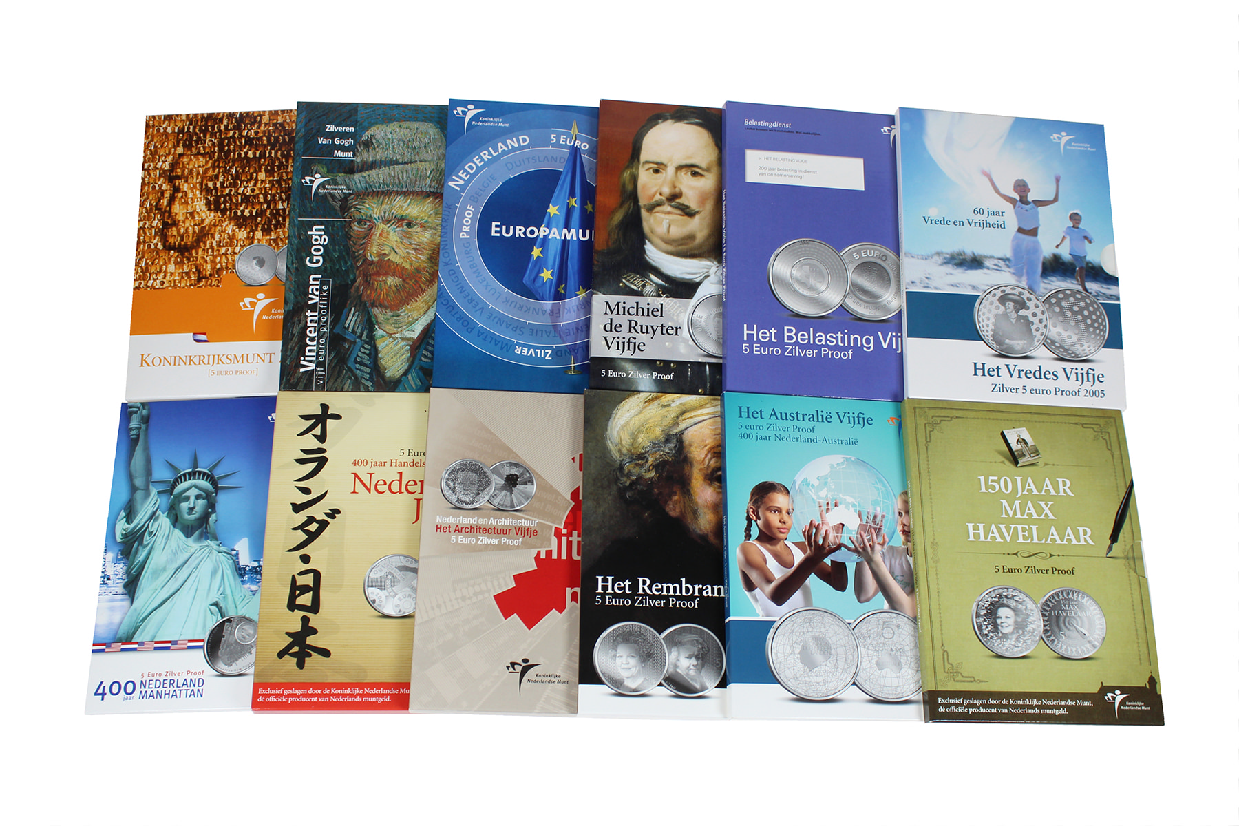 Lot (22) zilveren herdenkingsmunten van 5 euro 2003 Vincent van Gogh t/m 5 euro 2013 Vredespaleisvijfje. Complete serie! Proof.