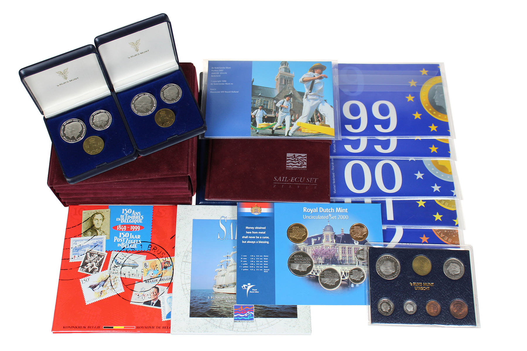 Doos met FDC- en proofsets uit de periode 1980-2001, alsmede set Sail ’95 en Sail Ecu-set 1995.