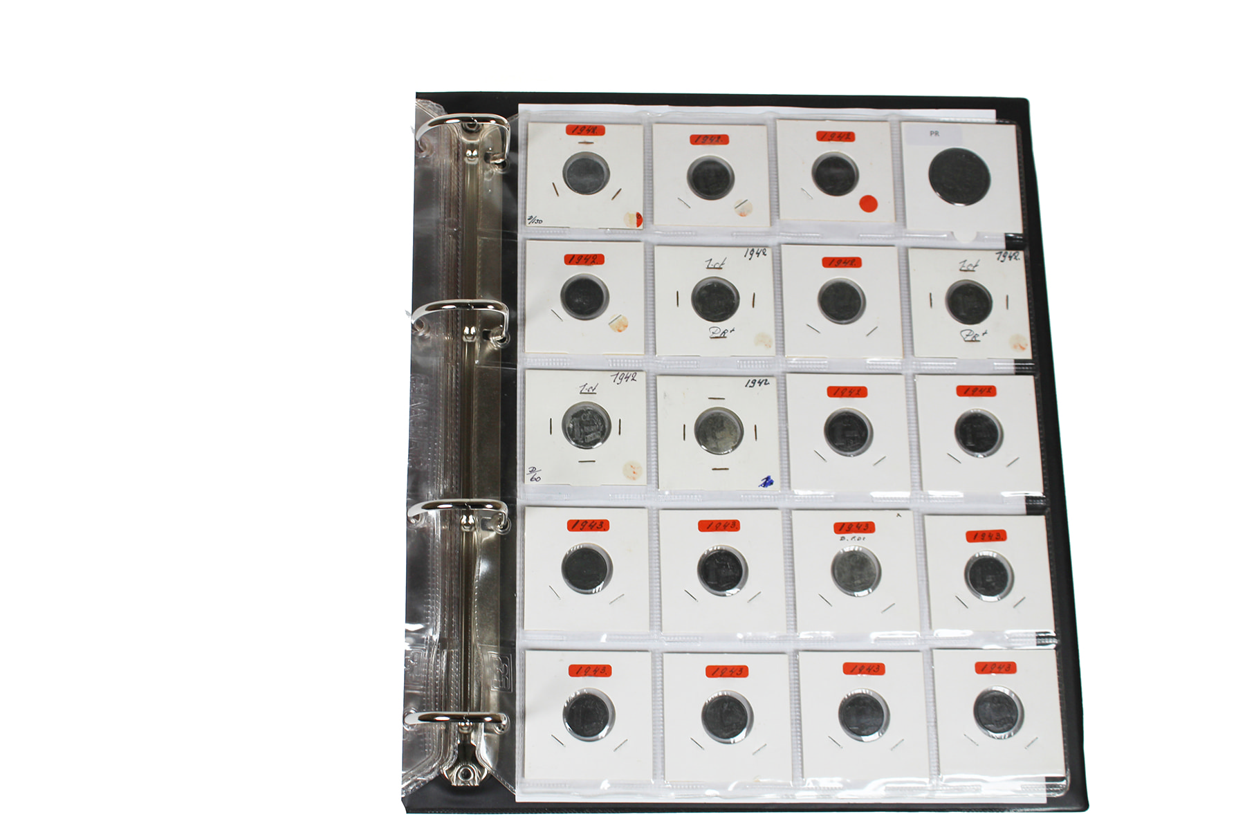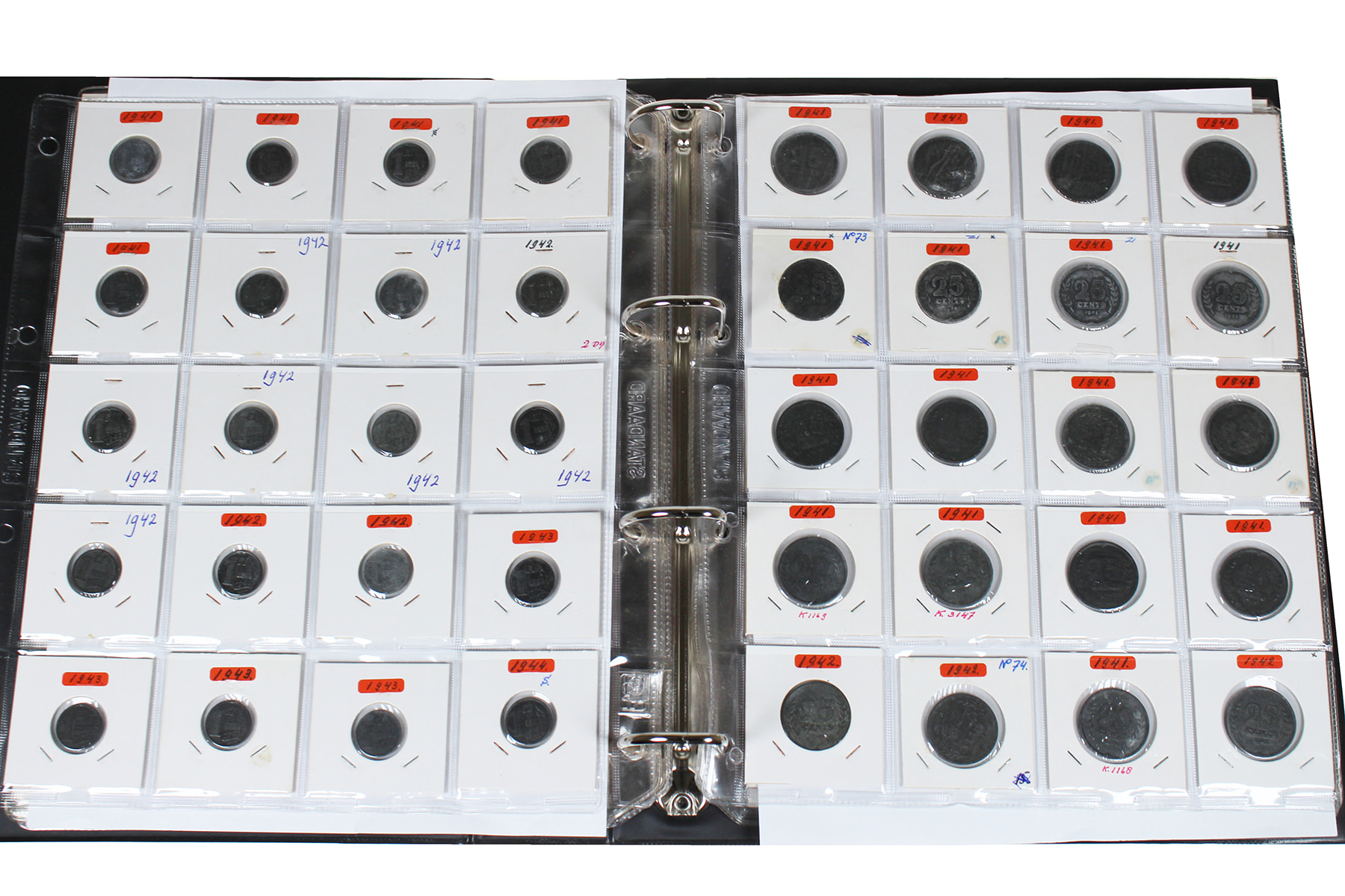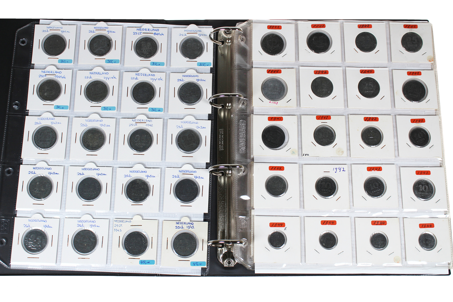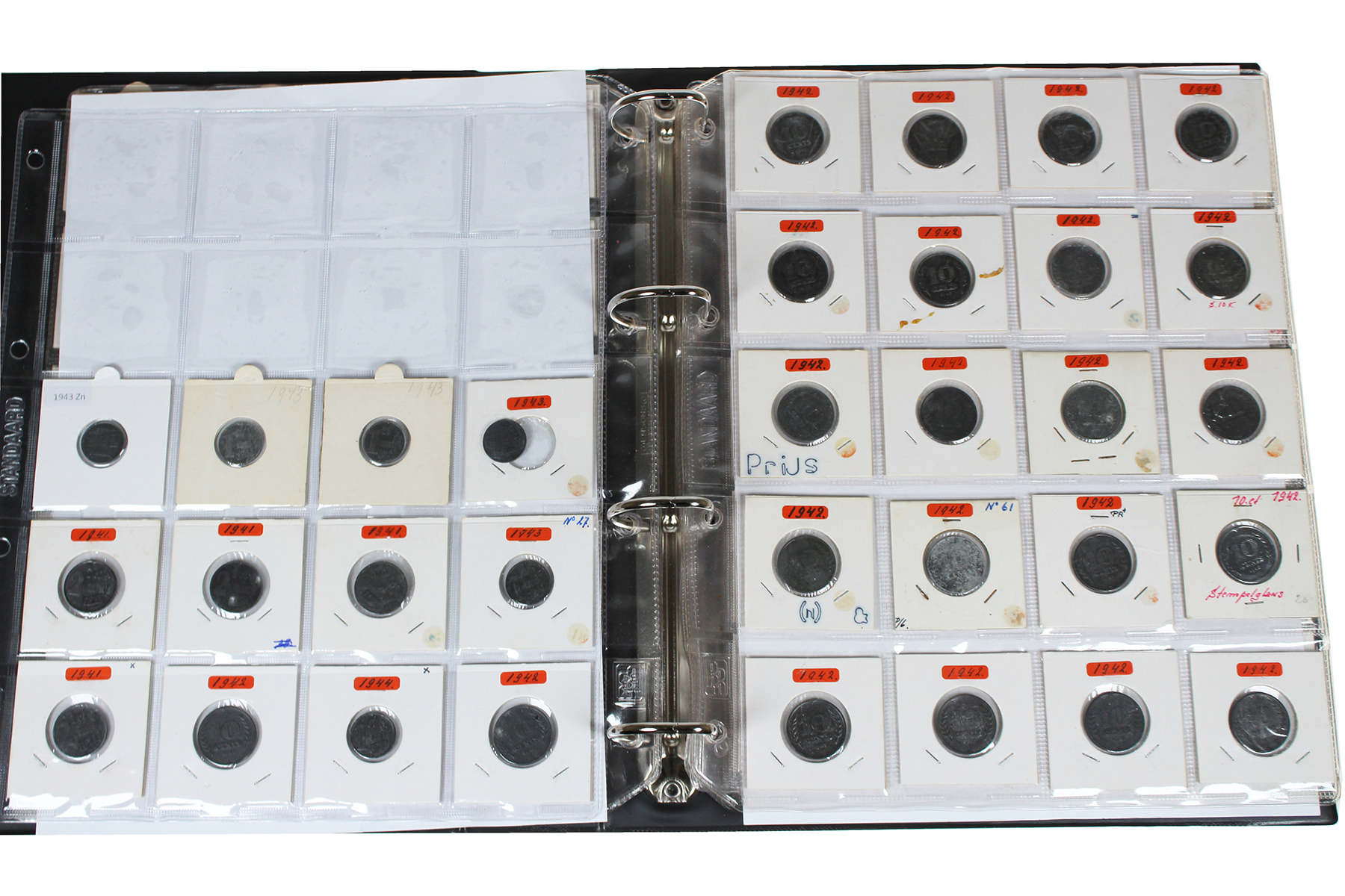 Zwart album met ca. 170 stuks zinken munten uit de periode 1940-1945 2e wereldoorlog. 1 - 2 ½ - 5 - 10 en 25 cent.