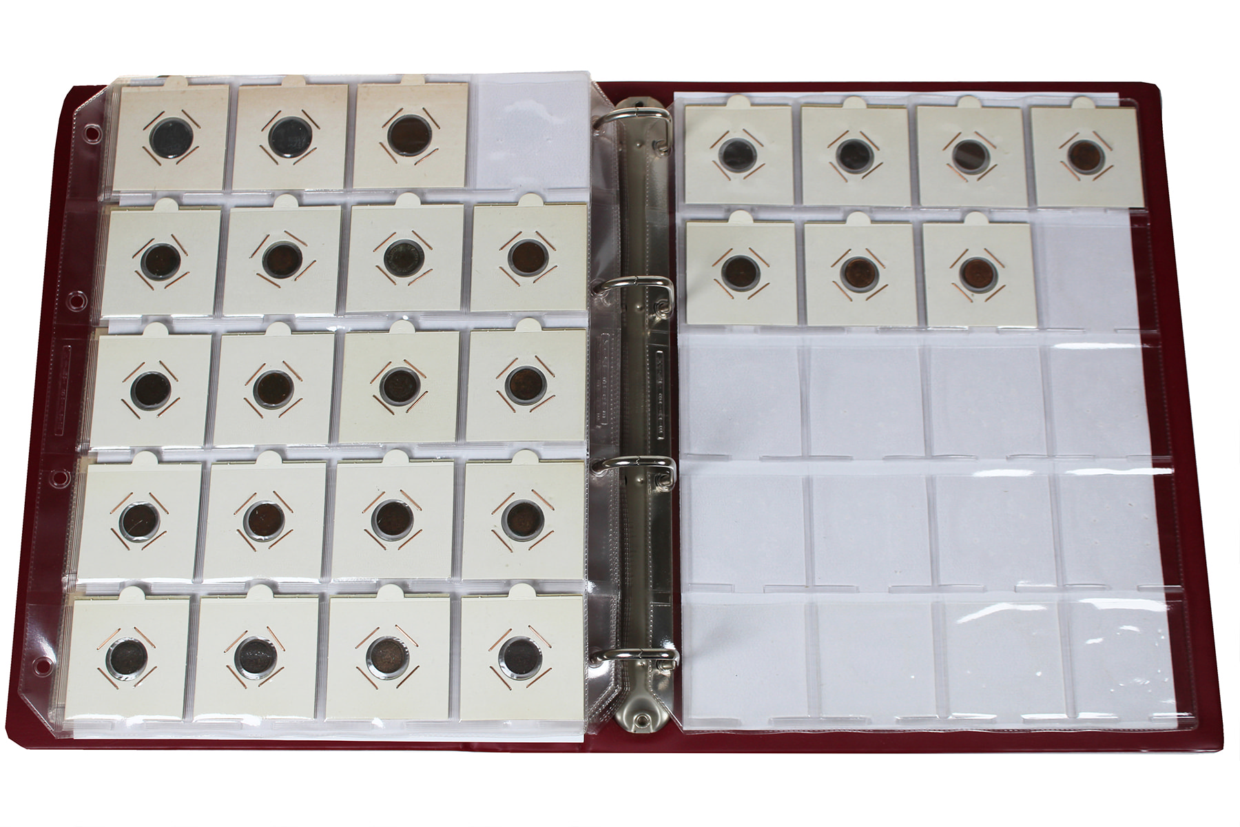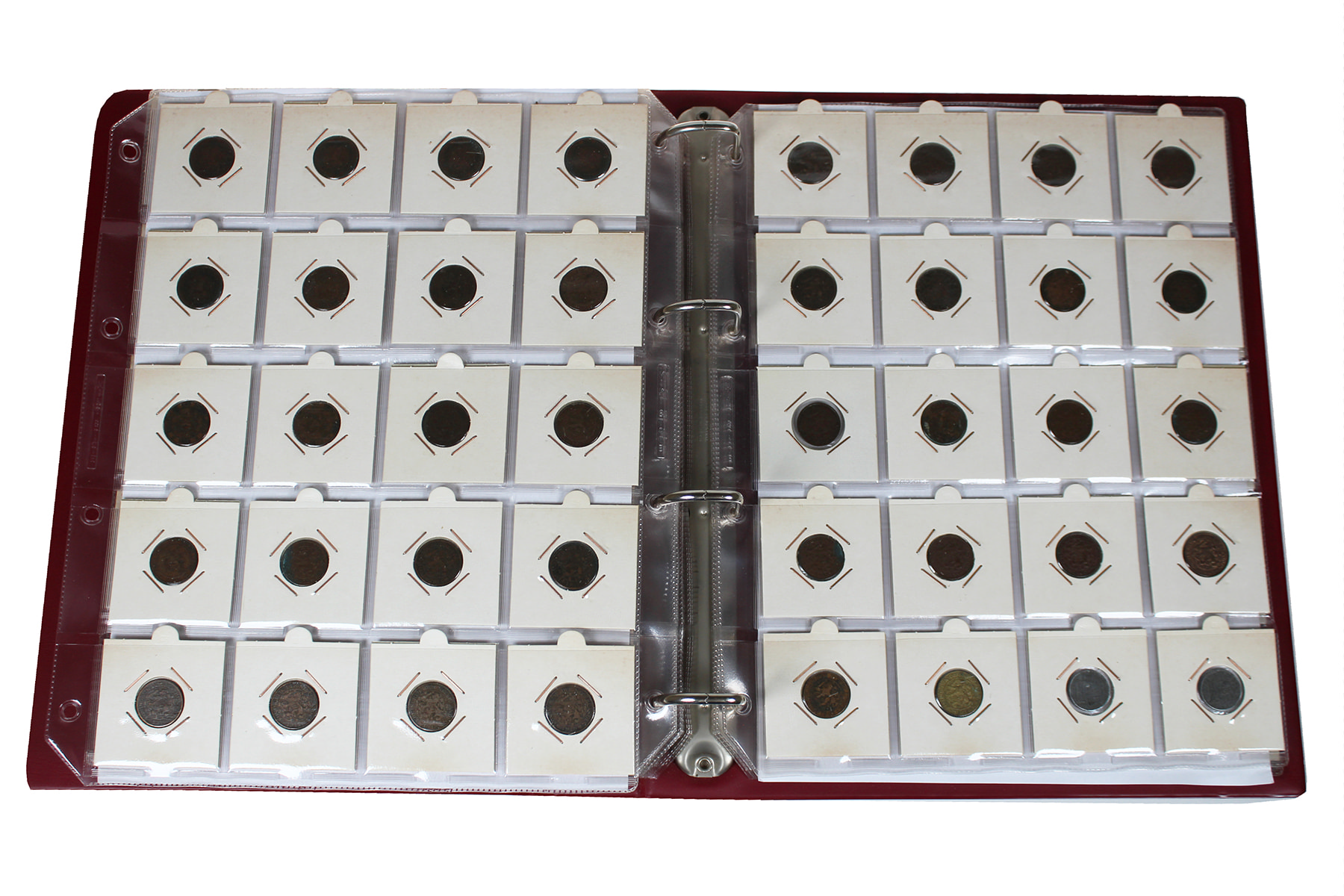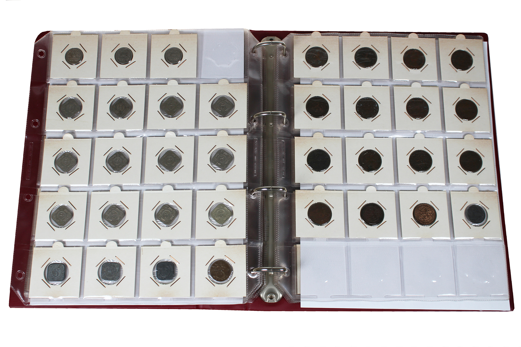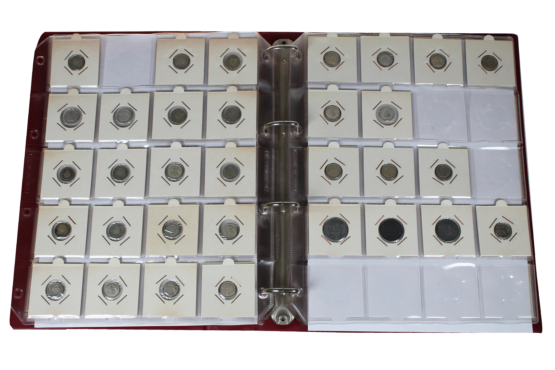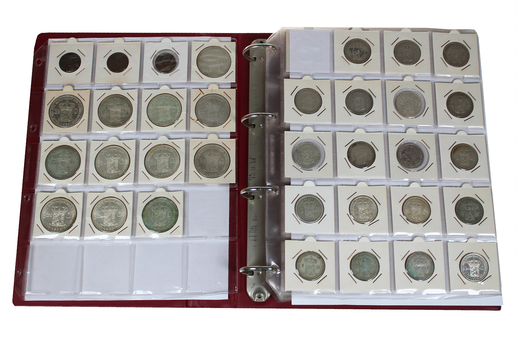Rood album met munten Wilhelmina. Van ½ cent t/m rijksdaalder. Veel zilver en schaarse jaren.