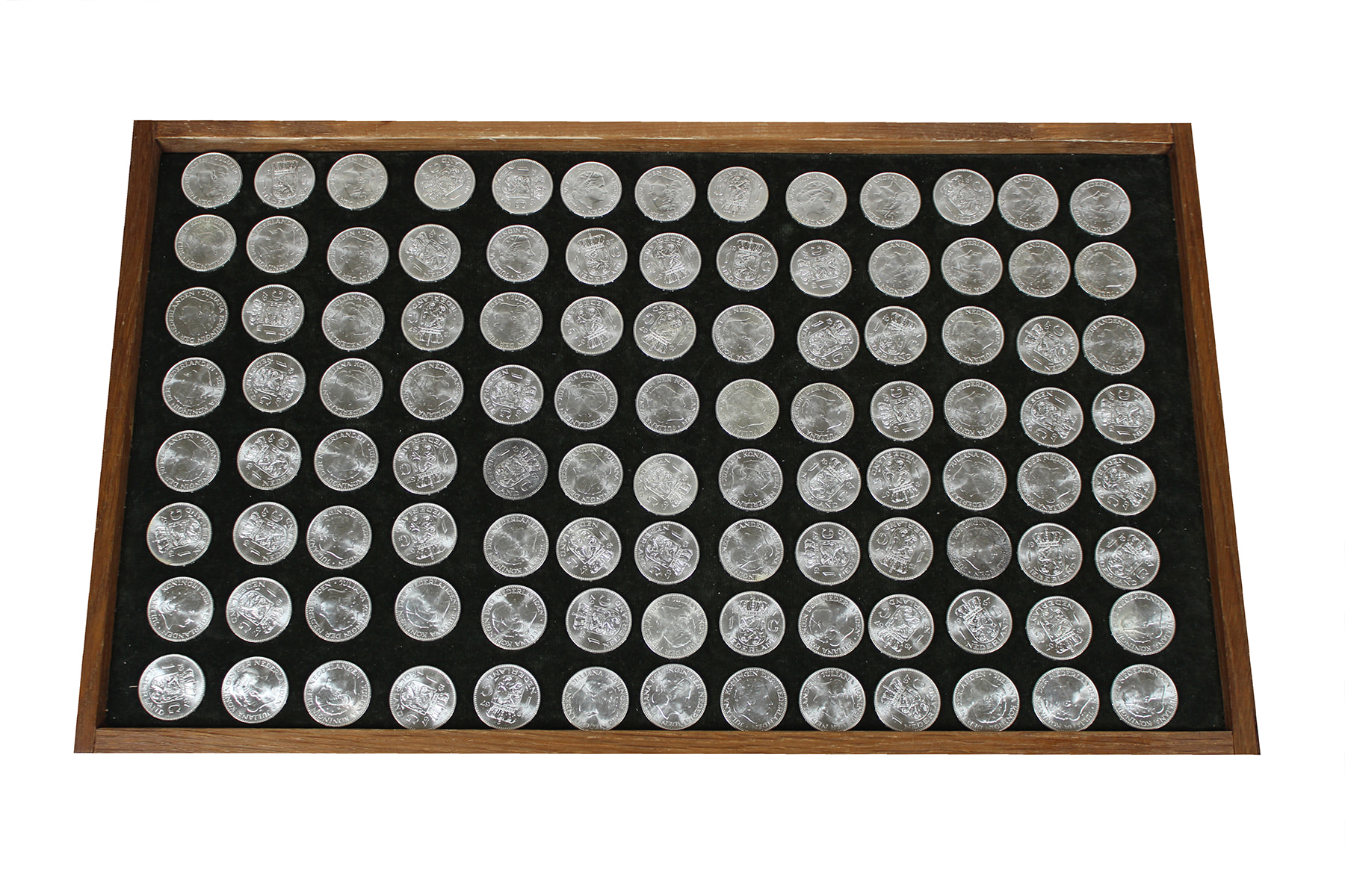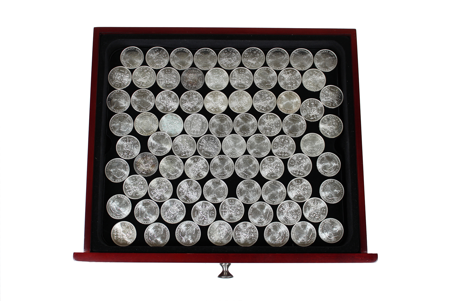 Kistje met eveneens van ’s Rijks Munt afkomstige zilveren guldens van Juliana! Ca 180 stuks. First strike - UNC.