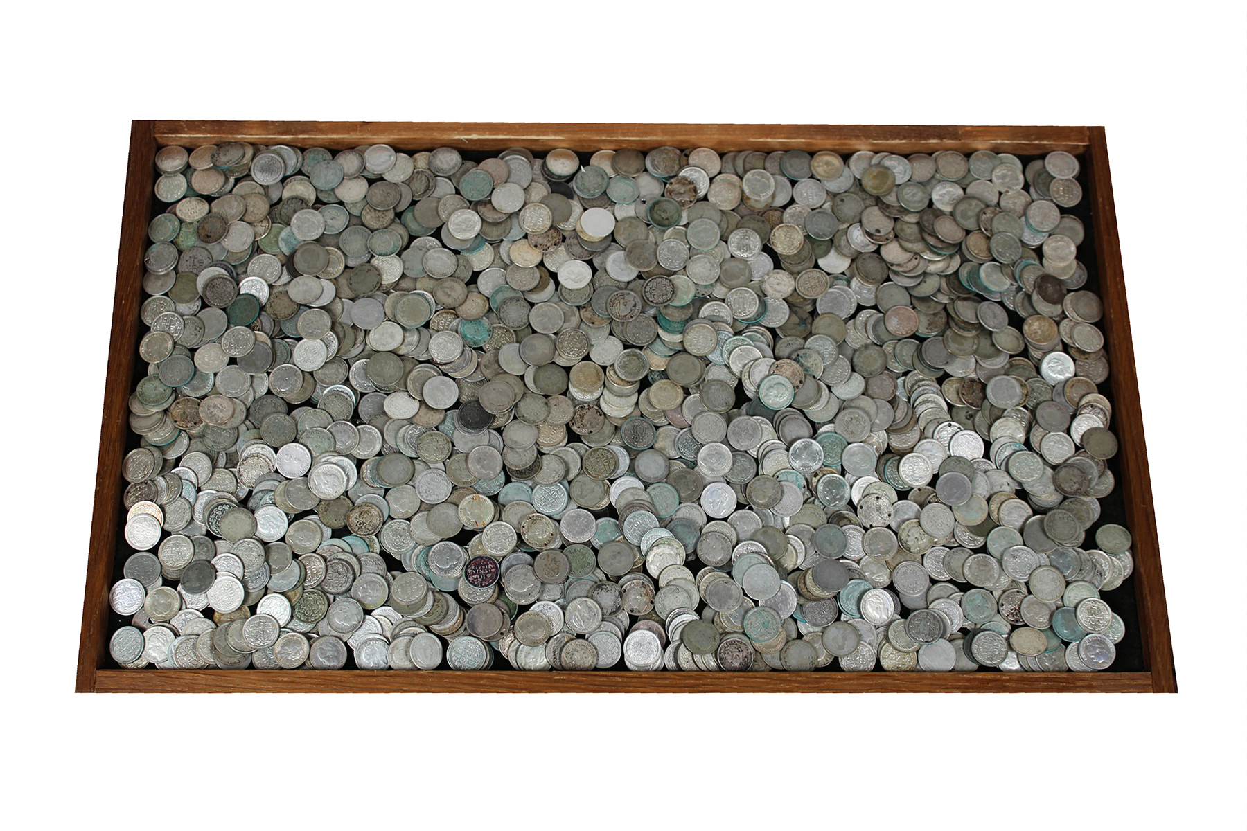 Bakje met honderden, misschien wel meer dan 1.000 stuks zilveren dubbeltjes Wilhelmina 1897-1941. Ca. 1750 gr.